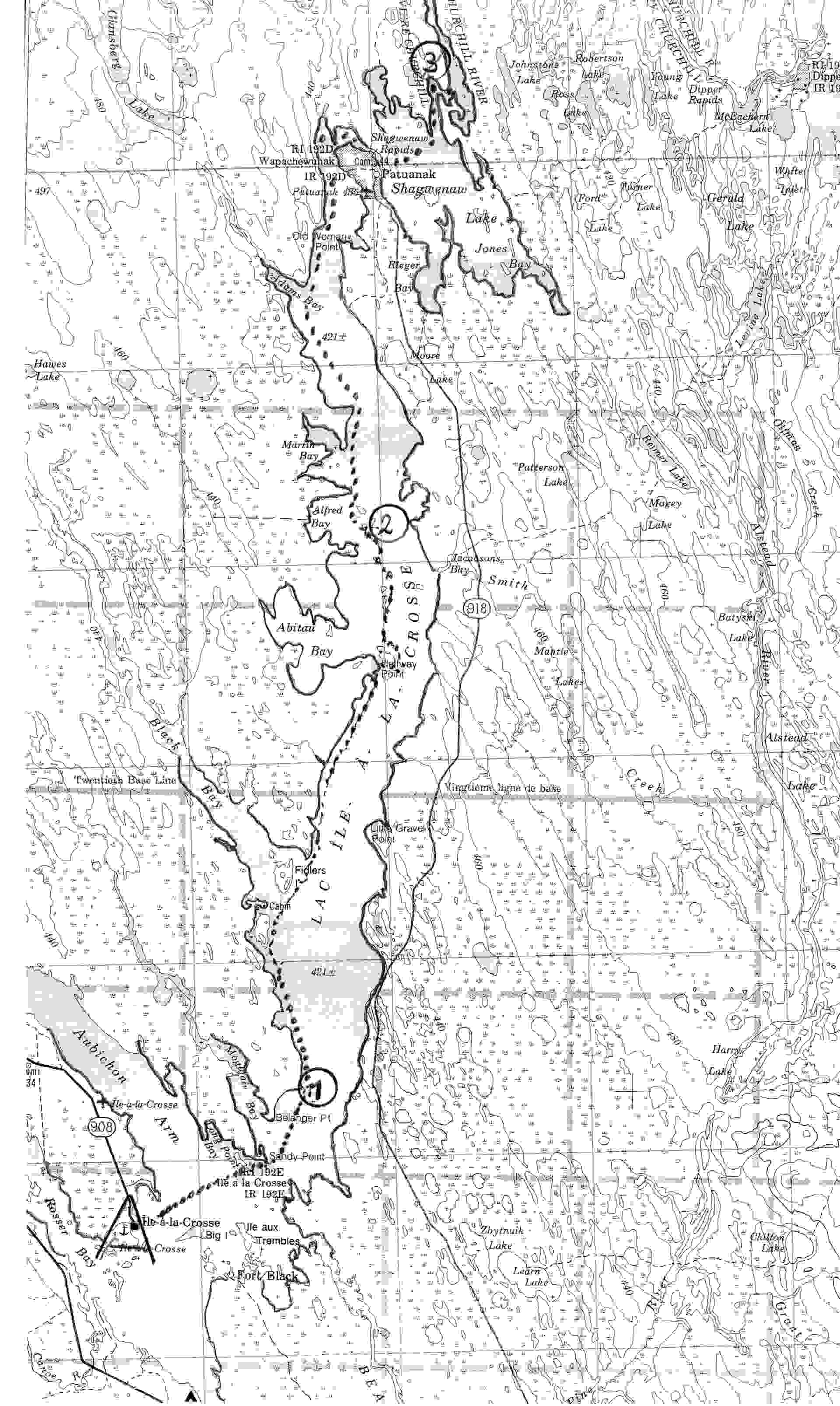 Ich war nun auf dem kleinen Devilsee-‑Teufelsee. Seit meinem verlassen der 2 Minuten Insel war der Seespiegel um 12 Meter gefallen auf dieser kurzen Strecke, das war was, schnelle Gewässer überall - dann ging`s in die schmale Bucht Richtung Süden hinein in die Otter Rapids, weit dahinten überspannte eine große Brücke den Churchill River, es ist die No 102 eine Schotterstraße, Holzfällerstraße.