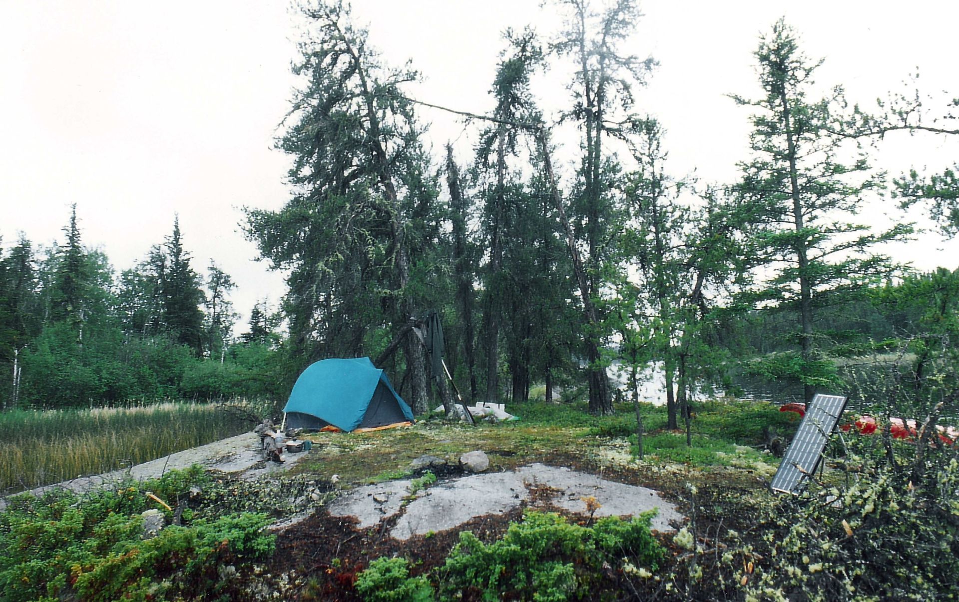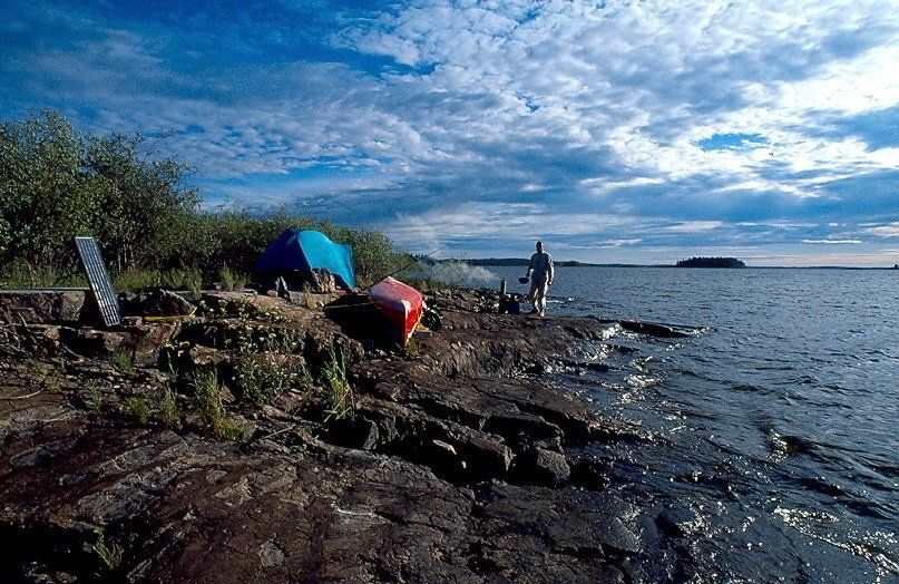 Auf einigen der Inseln standen Zelte. Urlauber im Nationalpark. Dann kam ich an den Kanadiern vorbei die mein Kanu getragen hatten. Sie hatten eine große Leine aufgespannt und ihre Kleidung hing im Wind. Sie tranken Bier aus Dosen. Zuerst wollte ich zu ihnen gehen mit ihnen Campen, doch was hielt mich davon ab, nein, ich fahre weiter, Zelte allein. Etwa 1000 Meter weiter fand ich einen wunderschönen Platz. Ich zeichnete die Stellen gar nicht mehr auf der Karte ein wie am Anfang. Ich wusste aber wo ich war, aber so müde war ich. Eine wunderschöne Stelle war das. Ich weiß nicht mehr ob es eine Insel oder Halbinsel war. Jedenfalls musste ich meine Sachen hoch tragen auf eine glatte Stelle die total mit dickem Moos bewachsen war. Zwischen Fichten stellte ich das Zelt auf, sagenhaft schöner Platz. Es würde ein federndes Schlafen werden voller Aromatischer Düfte. Ich kochte nun schon seit 2 Tagen nicht mehr, aß also wieder trockenes Müsli, getrocknete Früchte. Diese Tour hats in sich. Body Building, Diätmäßig, Körperschlacht, Materialschlacht, naja. Der Abend wurde einfach Fantastisch. Ich saß erhöht, oben auf der Insel, überschaute andere nahe Inseln. Kein Wind, das Wasser wurde in Rosarotes Licht geflutet. Eine ganz dicke Weiße Wolke kam an einer Seite hoch. Türmte sich sehr hoch auf, strahlte Schneeweiß. Darüber der Himmel, Blass bis Tiefblau. Am Horizont der Sonnenuntergang Zartrosanes Leuchten. Die Konturen der Bäume gegen das Licht. Unten am Ufer jagte ein großer Hecht, die kleinen Fische sprangen aus dem Wasser als er hinter ihnen her war, um sich zu Retten. Der Horizont wurde richtig Rosagolden. Das spiegelte sich im Wasser. Über mir fingen die Sterne an zu leuchten. Ein Vogel fing an zu Singen. Er würde die ganze Nacht durchsingen. Damals wusste ich nicht das es der Veery war.. Das wusste ich erst als ich wieder in der BRD war und die Vogelstimmenkassette hörte die ich in Winnipeg im Zoo gekauft hatte, und nun die Stimmen vergleichen konnte. Dieser Veery singt und singt und singt und singt. Er hat eine sehr schöne Gesangsstimme. Ich freute mich schon bald wieder eine neue Angel zu kaufen, zu Fischen, das fehlte. Frische Zanderfiles, Hechte, auf so einer Tour, das war wichtig. Der Ofen hatte mir sehr gefallen. Die Wärme die schmackhaften heißen Pfannekuchen. Ohne dem war ich noch leichter Ausgepowert, fertig. Mein Hintern hörte gar nicht mehr auf zu schmerzen. Da nun kein Wind war, und es dunkler wurde waren nun die winzigsten No-‑Seums da, das sind solche kleinen Beißinsekten das sie fast nicht zu sehen sind. Sie erscheinen bloß als winzigstes Fleckchen auf der Haut. Aber die können zubeißen, vom feinsten. Aber dafür war das North Face V 23 sehr gut ausgerüstet, denn sein Innenzelt war aus Anti-‑No-‑Seum Material, so fein, das auch diese feinen Blutsauger nicht durchkamen. und ein schönes schlafen Garantieren.. Ich hatte schon andere Zeltzeiten erlebt wo ich morgens aufwachte und meine Augen nicht mehr öffnen konnte weil sie zerbissen waren.