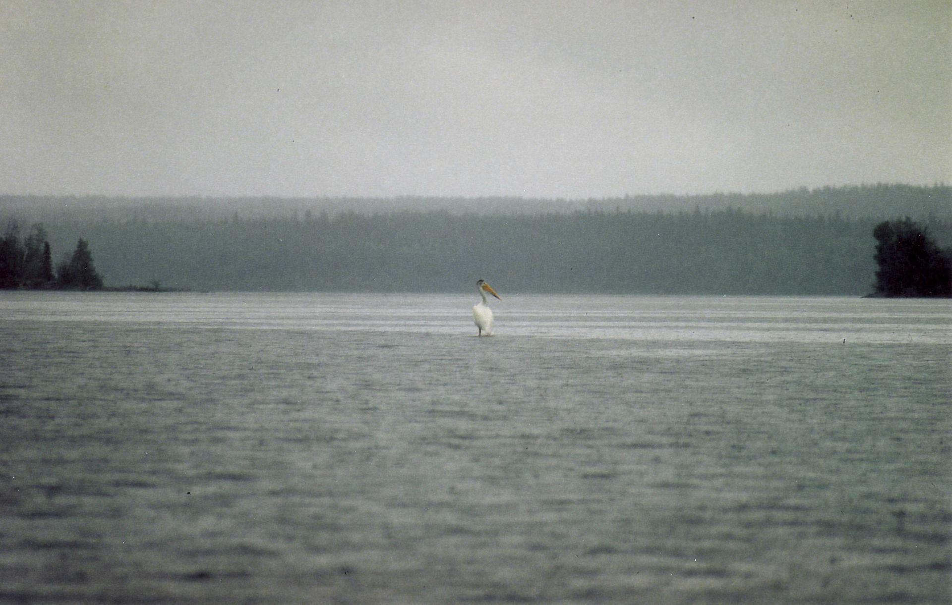 Ruhig legte ich einen Paddelschlag nach dem anderen ins 6 Grad kalte Wasser. Ein Weißkopfseeadler flog mit Geschrei von seinem großen Nest. Viele Pelikane glitten ruhig ohne Flügelschlag über mich hinweg. Manche Gruppen segelten auch ganz nahe an der Wasseroberfläche vor mir her. Ihre weißen Federn leuchteten und spiegelten sich an der Wasseroberfläche. Dann, nach mehr als 7 Stunden im Kanu, endlich Halfway Point, eine Inselgruppe, dort sollte es wohl gute Zeltmöglichkeiten geben. Als ich dort ankam, war es total windstill und die Stimmung war sehr angenehm, schön. Ich paddelte nun sehr ruhig auf dem See, die Uferbereiche waren sehr grün, dahinter dichter Waldrand, sehr dicht sah das alles aus. Da sah ich ein rotes Holzhäuschen auf einer der kleinen Inseln.