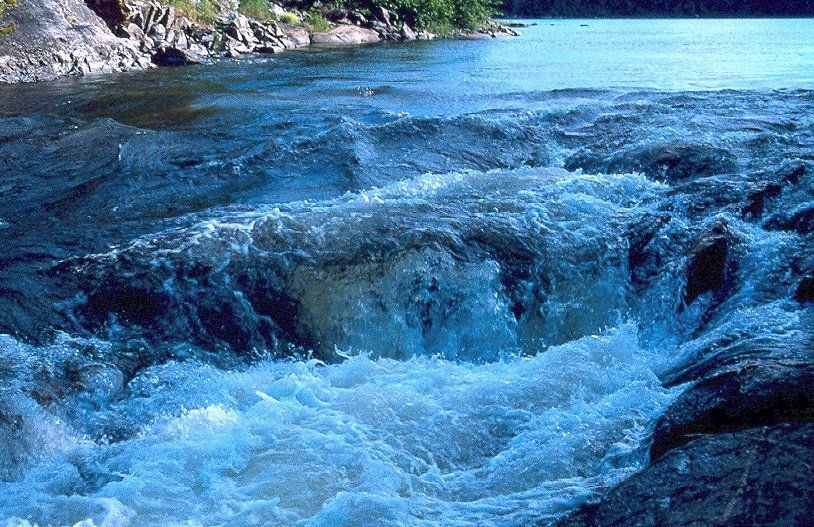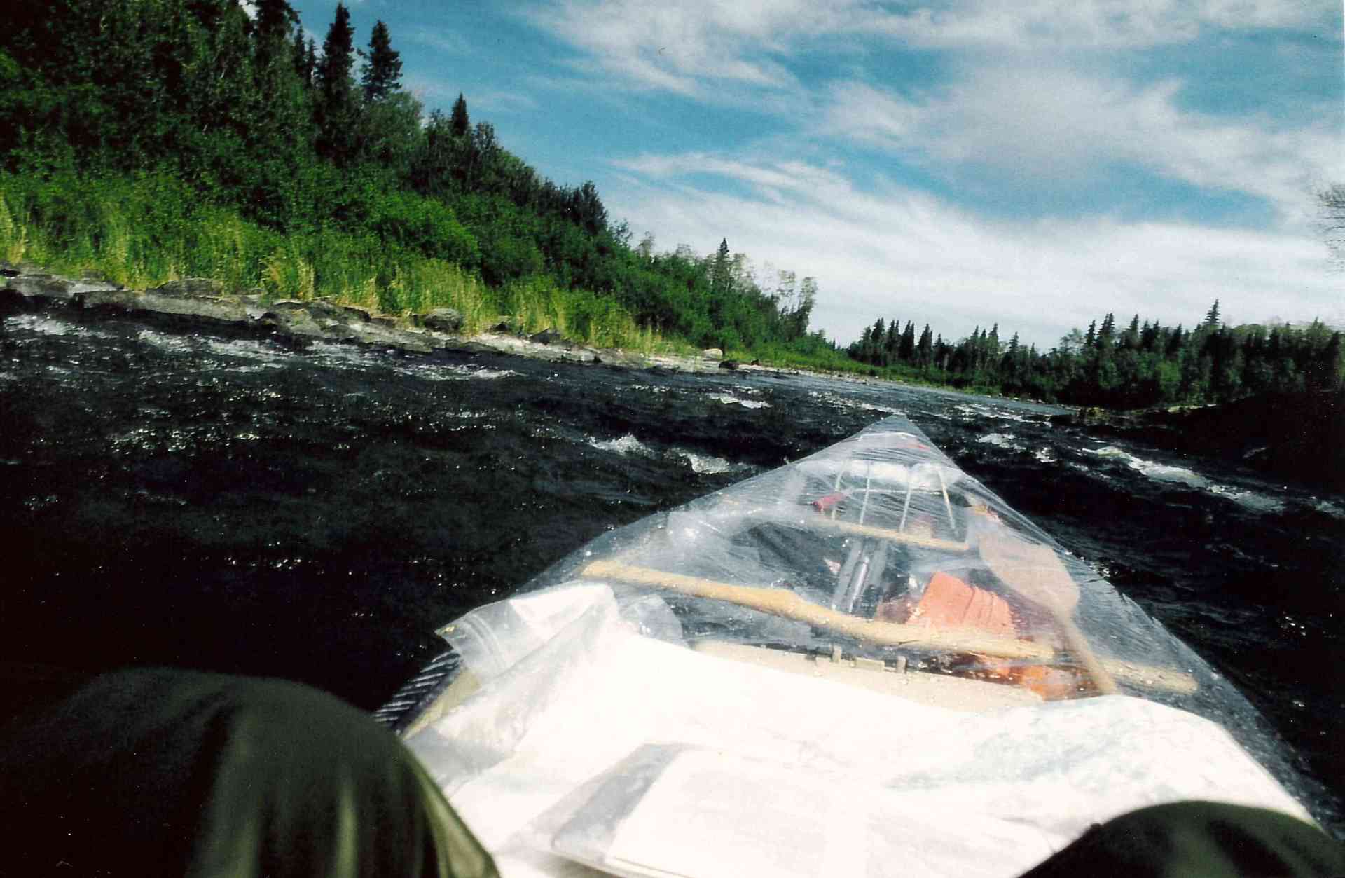 Um 10.10 Uhr legte ich vom Ufer ab und Paddelte los. Wolkenlos war es. Nun ging es Richtung Südosten durch einen engen Kanal von Windungen und Inselchen mit einigen schnellen Wassern und Fällen. Als ich zum ersten schnellen Wasser kam, sah ich, und fuhr drauflos, denn ich war in Fatalstimmung, mir Egalstimmung. Mein liebstes Mantra-‑Mir Egal-‑passt soo gut in die Welt - ohlala - da kam Stimmung auf - ich schriiiiie und schriiiie, als die Wellen auf mich zudonnerten, und das waren große Wellen, die höchsten die ich bis jetzt durchfahren hatte. Sie knallten über das Kanu hinweg und schleuderten es herum, aber alles ging sehr schnell - das wars dann schon. Ahhhhhhh, ein Morgenbad war das, mein Gesicht war Naß, ich Grinnste, wie der Grinch, denn die erste Lage Wasser war im Kanu. Während der weiterfahrt Schwemmte ich das Wasser aus dem Kanu, jedenfalls soweit möglich. Dann kam das letzte Gefälle bevor es in den Nipew Lake ging, das ich rasend durchfuhr. Es sah alles so einfach aus. Tiefschwarzes Wasser.