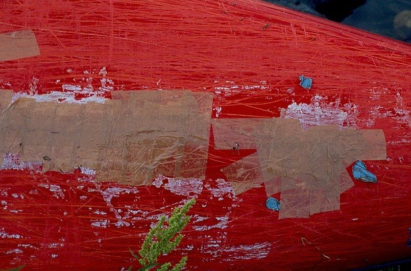 dergrund. Ich musste aufpassen. Das Kanu war wieder rissig. Die Stellen brachen immer wieder durch. Da nun auch das Duct-‑Klebeband zuende war wurde das Kanu von innen und außen mit diesem Braunen Superstarken dünnen Klebeband beklebt. Das hielt auch bis zum nächsten Kratzer und Abschürfen und Biegen.