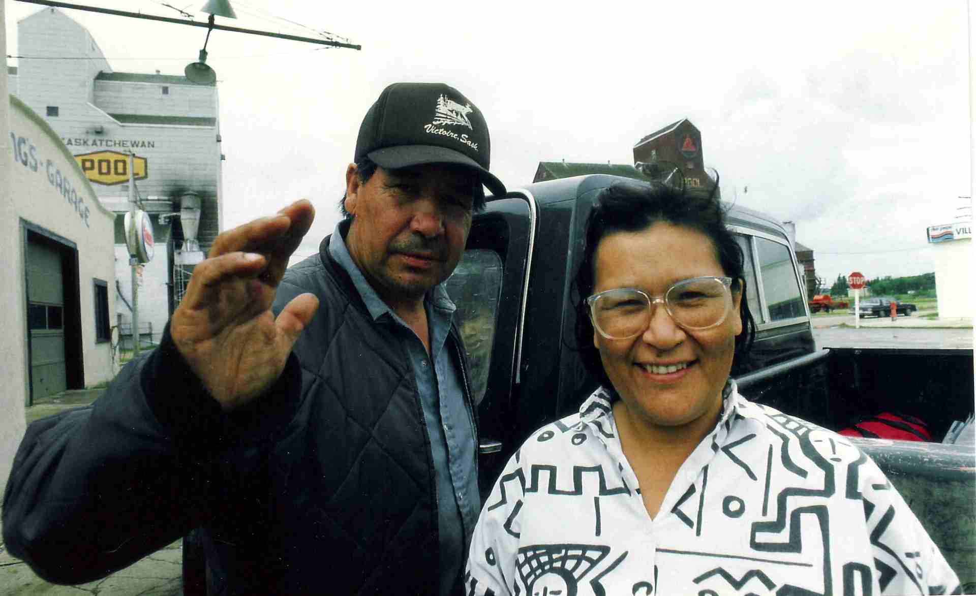 Ich stand 15 Minuten bis ein Grüner Ford Pick Up anhielt, und jemand fragte wo ich hin will ... ok - steig auf sagte die Frau am Steuer. Ich setzte mich auf die Ladefläche, hinten, offen, und schon ging`s los. Ich freute mich das es so schnell ging. Drei Menschen waren im Auto. Eine kräftige Indianerin, ein Indianer Mann, und ein Kind, deren Kind. Es Regnet ununterbrochen weiter, aber ich bin windgeschützt da ich gegen die Fensterwand lehne und der Fahrtwind an mir vorbeisaust. Die Frau gibt sehr gut Stoff. Wir jagen an den Wäldern vorbei. Ich nehme meine Kamera raus und mache einige Fotos. Zweimal wird das Glasfenster zur Seite geschoben und eine Flasche Sekt zu mir gereicht, aber ich verneine freundlich, ich wollte nüchtern sein und brauchte auch keine Sektspritze. Aber die beiden vorne, sie zogen sich mehrere Flaschen rein. Ich schaute amüsiert zu. Nach etwa 2 Stunden Fahrt hielten wir an, ich weiß nicht mehr in welchem Ort, es war jedenfalls Typisch Country Saskatchewan, denn mitten im Ort waren große Getreidespeicher unmittelbar an der Eisenbahnschiene. Die beiden gingen raus um neuen Nachschub zu holen. Der Schnapsladen den kannten sie. Die Frau die etwas kräftiger und gesunder aussah als der Mann, der aber auch kein Suppenkasper oder Luftkottlett war, sah schön aus. Sie trug eine weiße Bluse mit großen schwarzen Indianersymbolen. Sie hatte ein volles Gesicht, fleischig mit einer gesunden leichten Bräunlichen Hautfarbe. Hinter der hohen Stirn war ihr Schwarzes Haar nach hinten gekämmt. Sie trug eine große Brille mit einem durchsichtigen Gestell. Ihre Nase war kräftig und von den Seiten der Nase gingen zwei glatte Linien herunter, die ihre Wangen anzeigten. Die Freundlichkeit die ich ihnen gegenüber ausstrahlte machte die Frau für kurze Zeit stutzig, sie hatte wohl zu viel Mist erlebt, aber dann siegte doch das wahre Wesen, und nicht die Vergangenheit und Erfahrung, und so strahlte sie auch und ihr Mann eine gutmütige Freundlichkeit weiter aus.