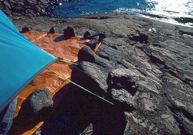 zusammengehalten. Ich hatte sämtliche Nähte in Winnipeg nochmal von innen mit Nahtdichter eingepinselt. Das sollte sich später gelohnt haben. Das Zelt baute ich auf eine orangene Plastikfolie auf, extra starkes Material.
