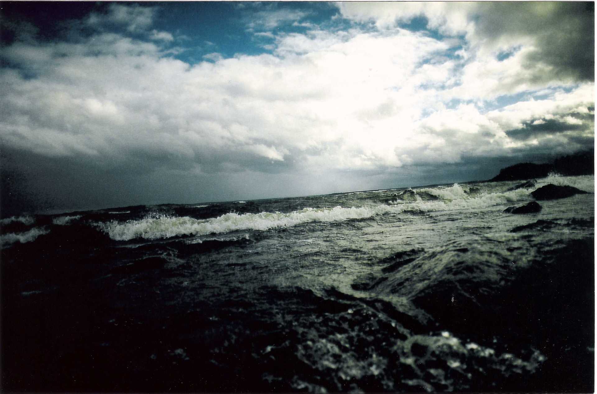 nördlichen Spitze der Belanger Bucht. Das Wasser ist klar und kalt. Leichte Wellchen rollen an den vom Grauen Himmel beleuchteten gelblichen Sand. Dahinter im Westen braut sich ein Gemisch aus Dunkelheit, Grauheit, Donner, Sturm zusammen.