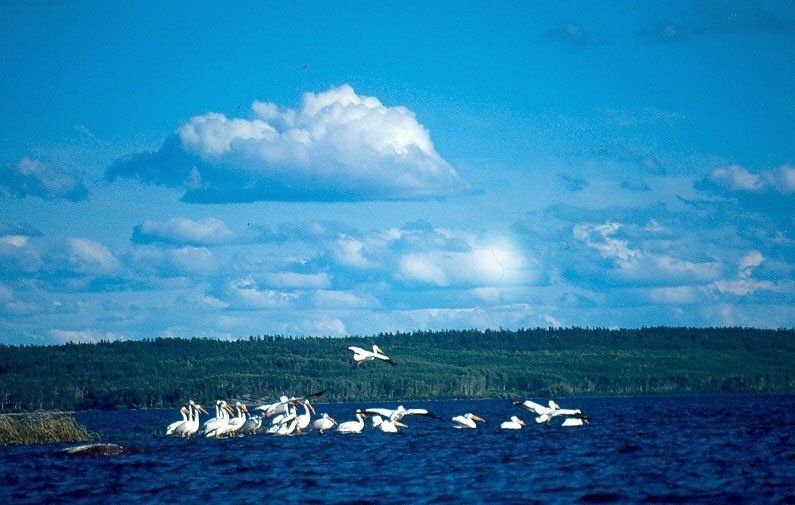 hatte. Er sprang mit ruhigen Sprüngen zurück in den Laubwald. Ich erwarte Schwarzbären. Ich höre viele Möwen. Einige Pelikane ziehen ruhig ihre Gleitflüge an mir vorbei. Graublauer Himmel überzieht den etwa 60 km langen See. Dies wird meine erste Übernachtung sein auf dieser langen Kanureise. Erst diesen großen See hoch, Richtung Norden, und dann hinein in die Churchill-‑River-‑Seeverbindungen, immer Richtung Osten, durch ganz