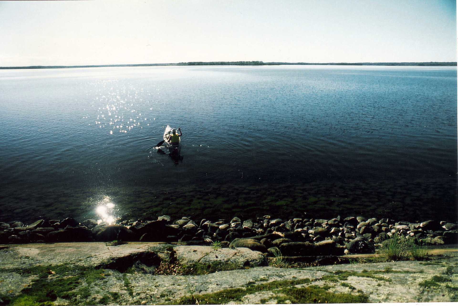 Als ich aus der windigen Black Bay herausgekommen war, konnte ich gut im Windschatten des Ufers entlang paddeln. Ich aß 2 Bananen während der Fahrt und trank Wasser. Das war jetzt meine erste lange Kanufahrt, meine Solar-‑Kanu-‑Expedition zur Hudson Bay. Nun gut, beinahe wäre ich zuvor über Bord gegangen, als die Wellen von der Seite kamen. Interessante Erfahrung. Sie war gespeichert auf der Festplatte meines Verstandes.
