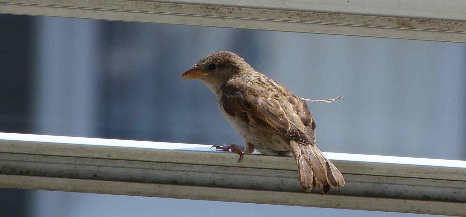 Während seiner Tage auf dem Balkon mit nur einem einzigen Abflug zum gegenüberliegenden Dach,saßen die Hausrotschwanz füttere mich Jugendlichen in seiner Nähe auf dem Dach.Und auch die Stare gegenüber reihten sich neugierig in seine nahe Umgebung ein.Aber er nahm das alles nicht wahr.Er schaute lieber als Winnetou Spatz und erfahrener Balkon Indianer nach unten ,oder in die Schräge,mal neugierig,mal verdrießlich,und sehr oft nach unten auf die Wiese und den Garten.