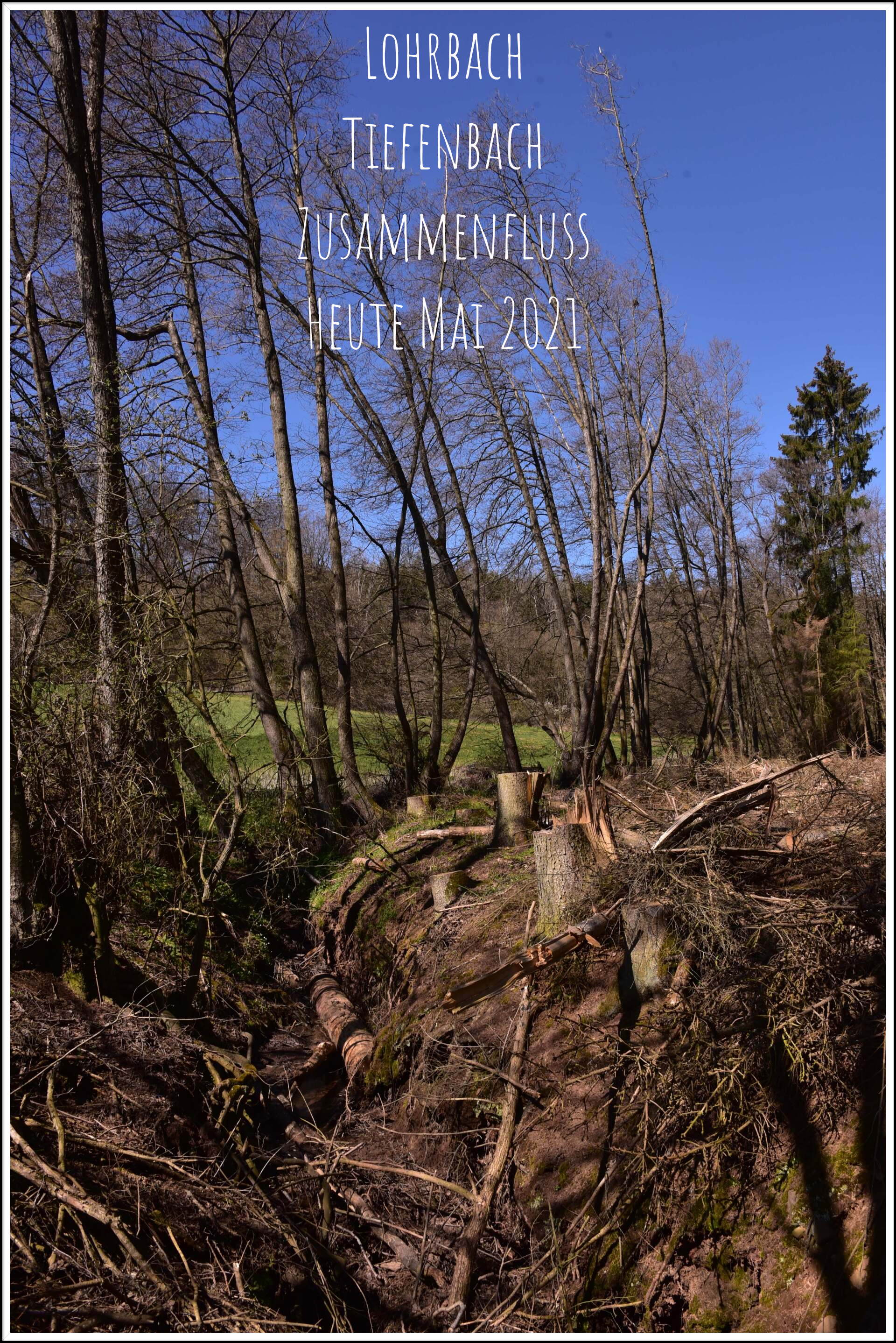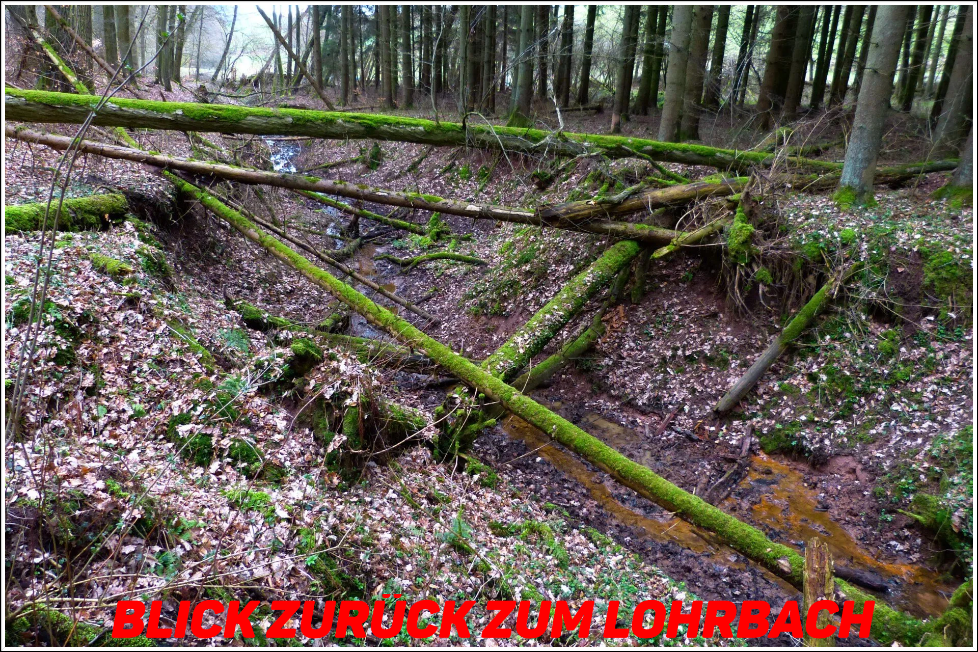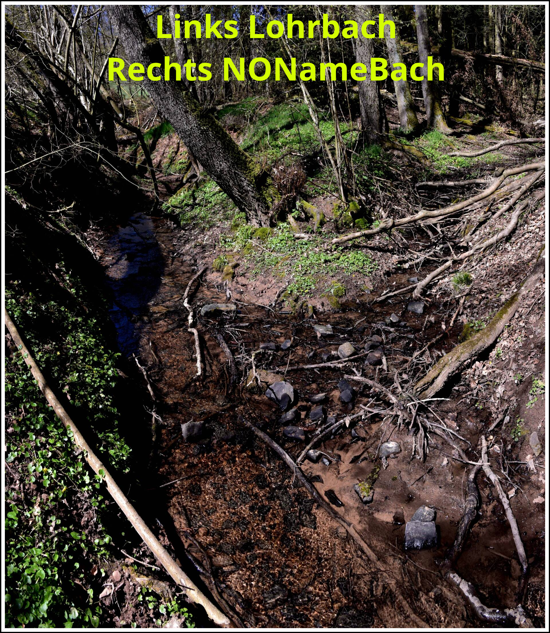 An dieser Position kommt ja links der Tiefenbach der sich 25 Meter zuvor mit dem Lohrbach vermischte , aber von dort an dann Lohrbach heißt,wohl weil ein Kelte damals das Wort Lohr für den Bach den sie von der Keltenburg der Altenburg sehen konnten,genannt hatten. Aber von rechts kommt auch dieser "NoNameBach", und dieser NoNameBach Richtung folge Ich, Du, Er, Sie und Es nun, um dann erst mal des Feuchtgebiet zu erkunden, das zwischen diesen beiden obigen Wasserläufen liegt in dem früher die Waldschnupfen Schnepfe jodelte und flog und rief und lächelte,da im Sumpfgebiet zwischen Tiefenbach und NONameBach, und dann später von dem entfernten Waldweg weiter in diesen Tiefenbach Buchenwald mit seinen großen größten monströsen großen übergroßen Schluchten, den der Tiefenbach dann durchfließt,wenn Wasser vorhanden ist,das ja seit der großen Hitze 2003 auf einmal weg war und so auch der Tiefenbach.