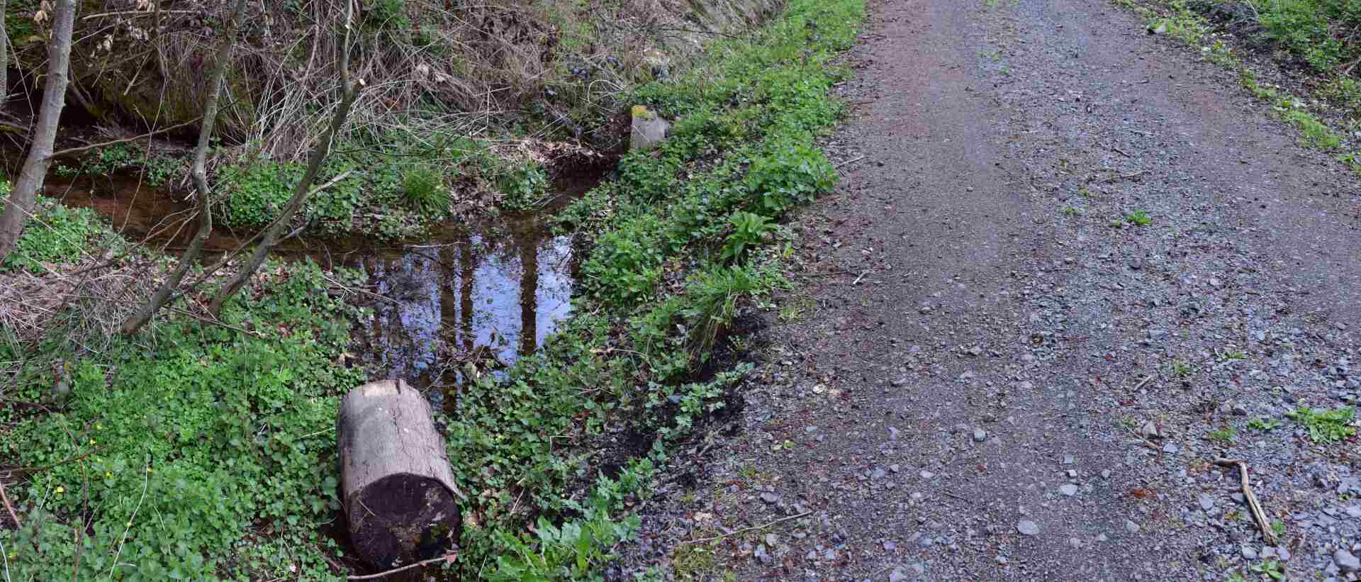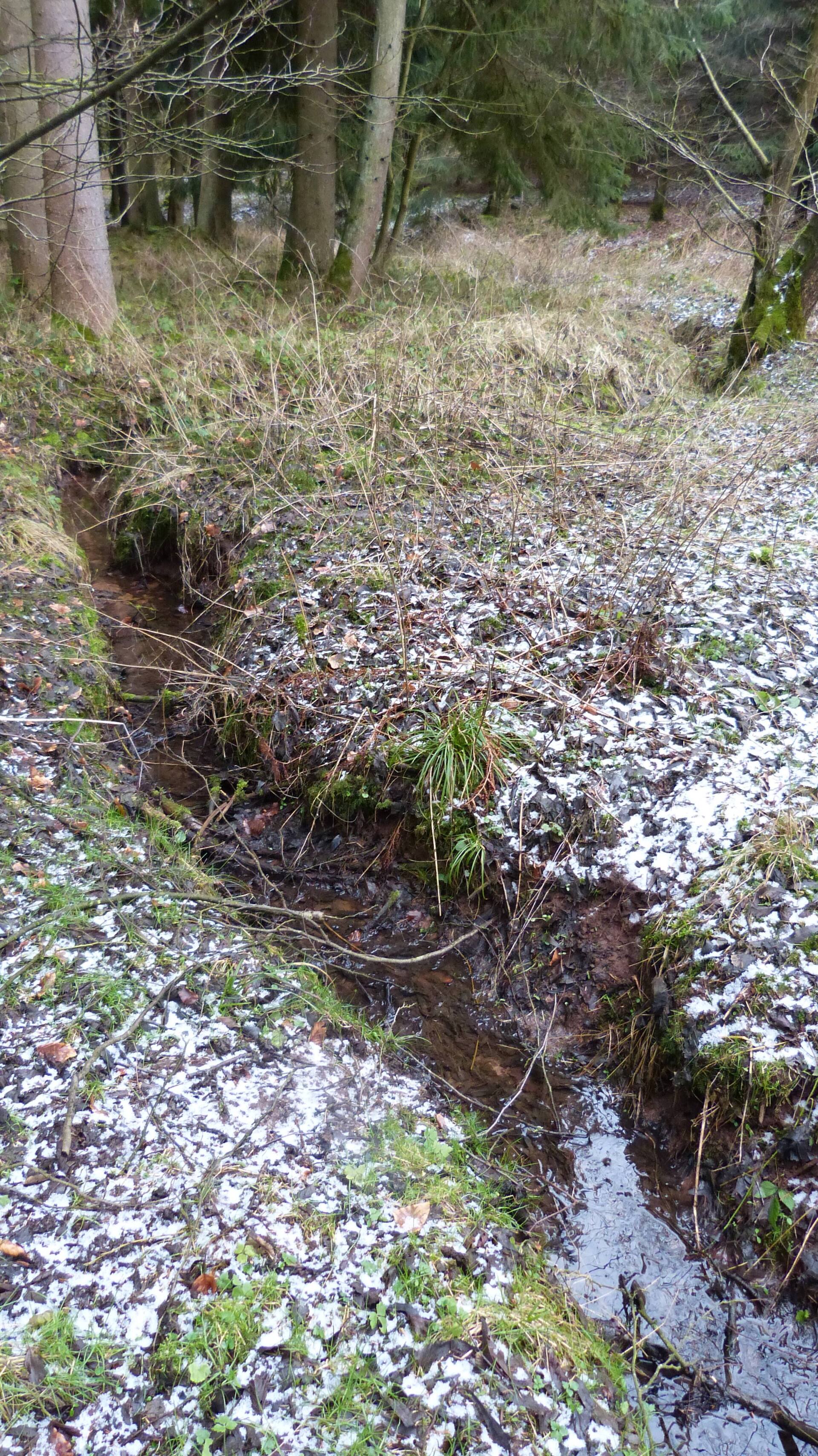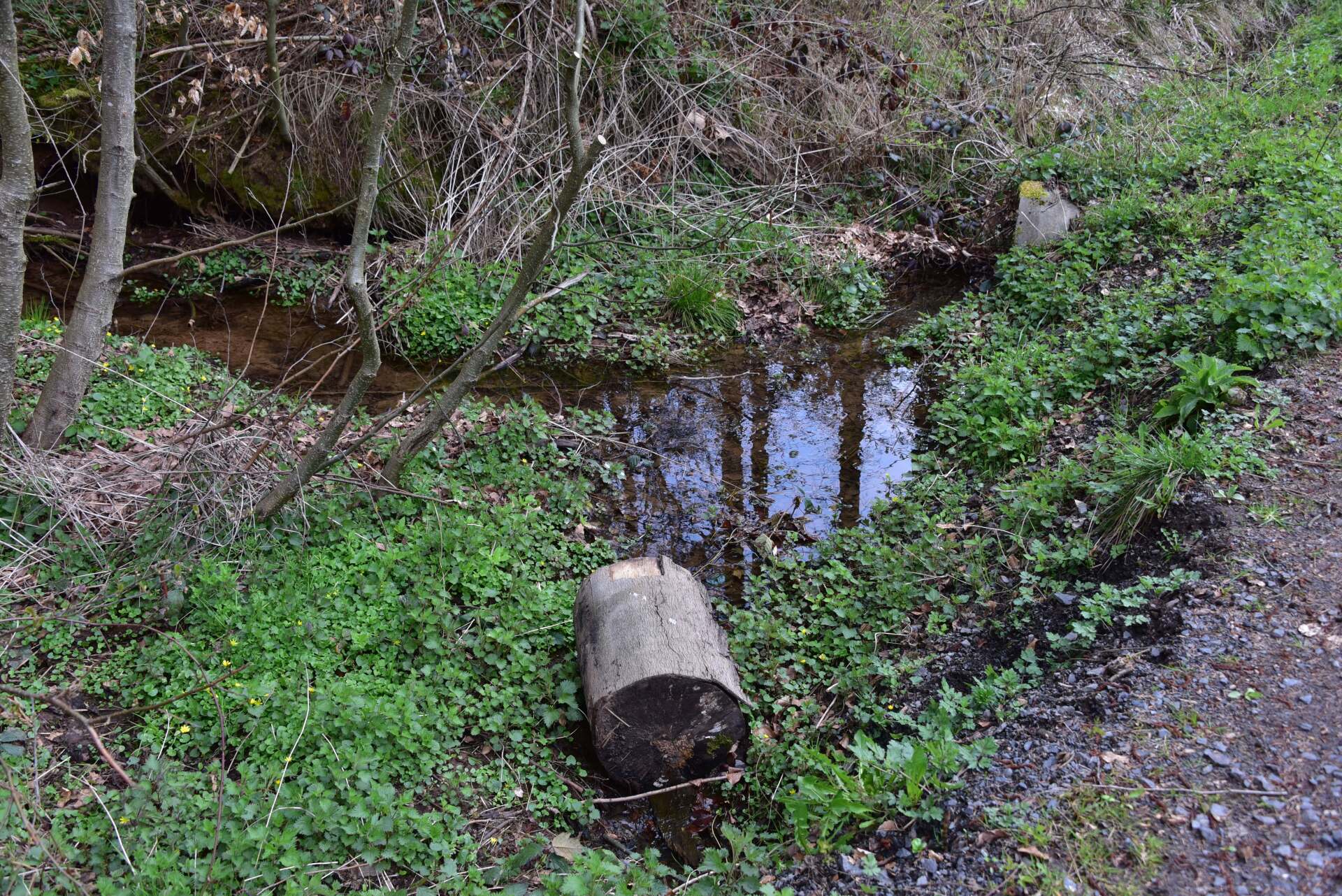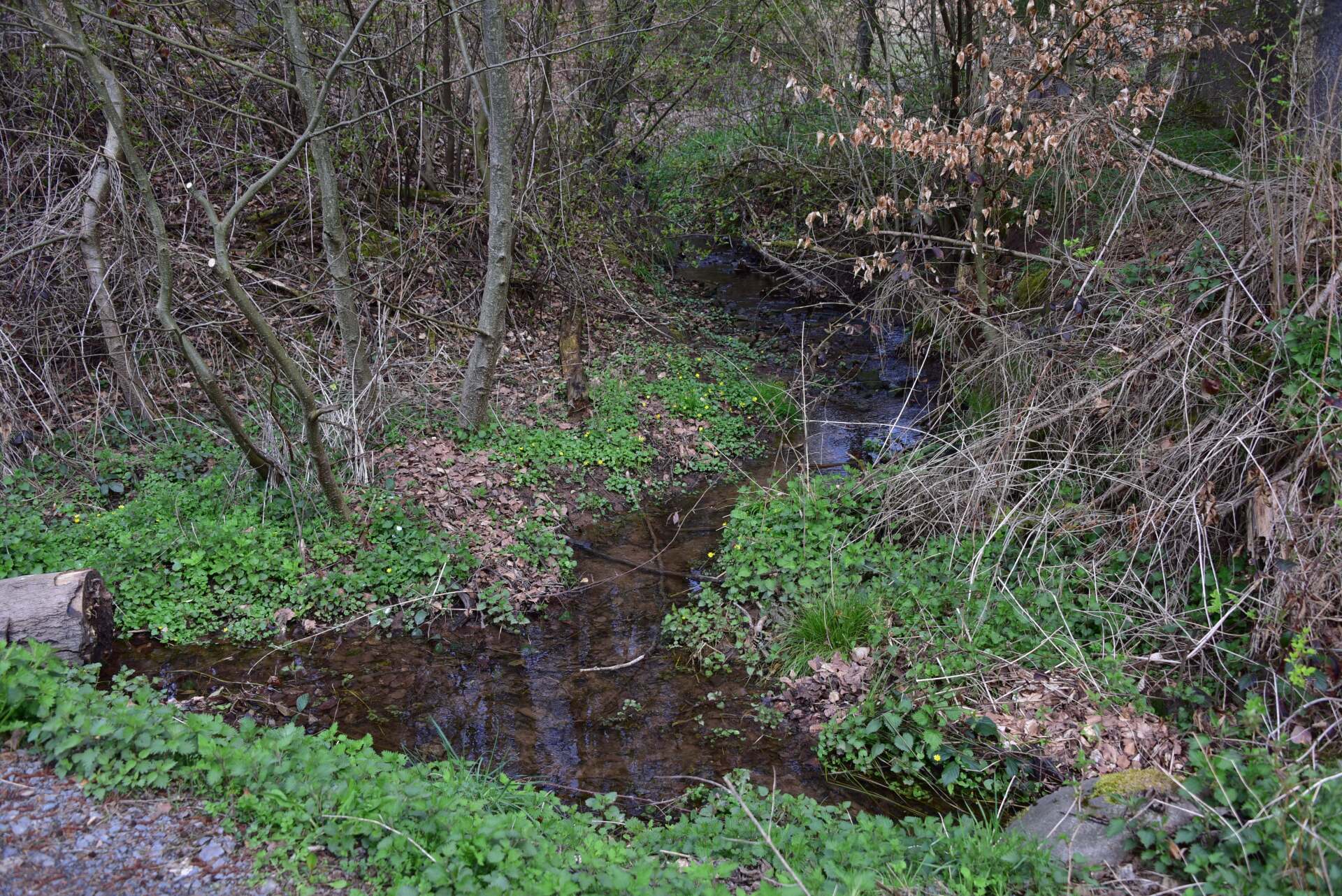 Foto unten NONameBach wiedererscheinen und Fortführung zu einem weiteren Sumpfgebiet in dem auch Feuersalamander wohnen.Der NONameBach führt dann weiter zu den Berghängen wo er die Hänge entwässert