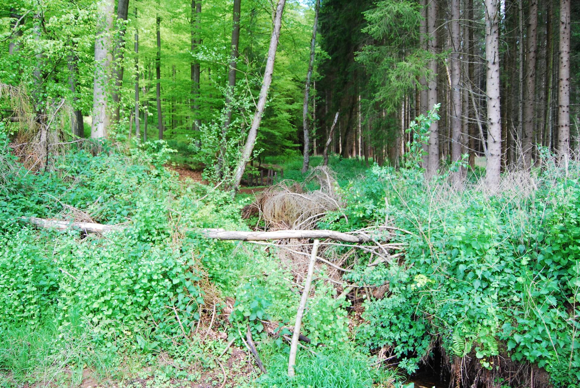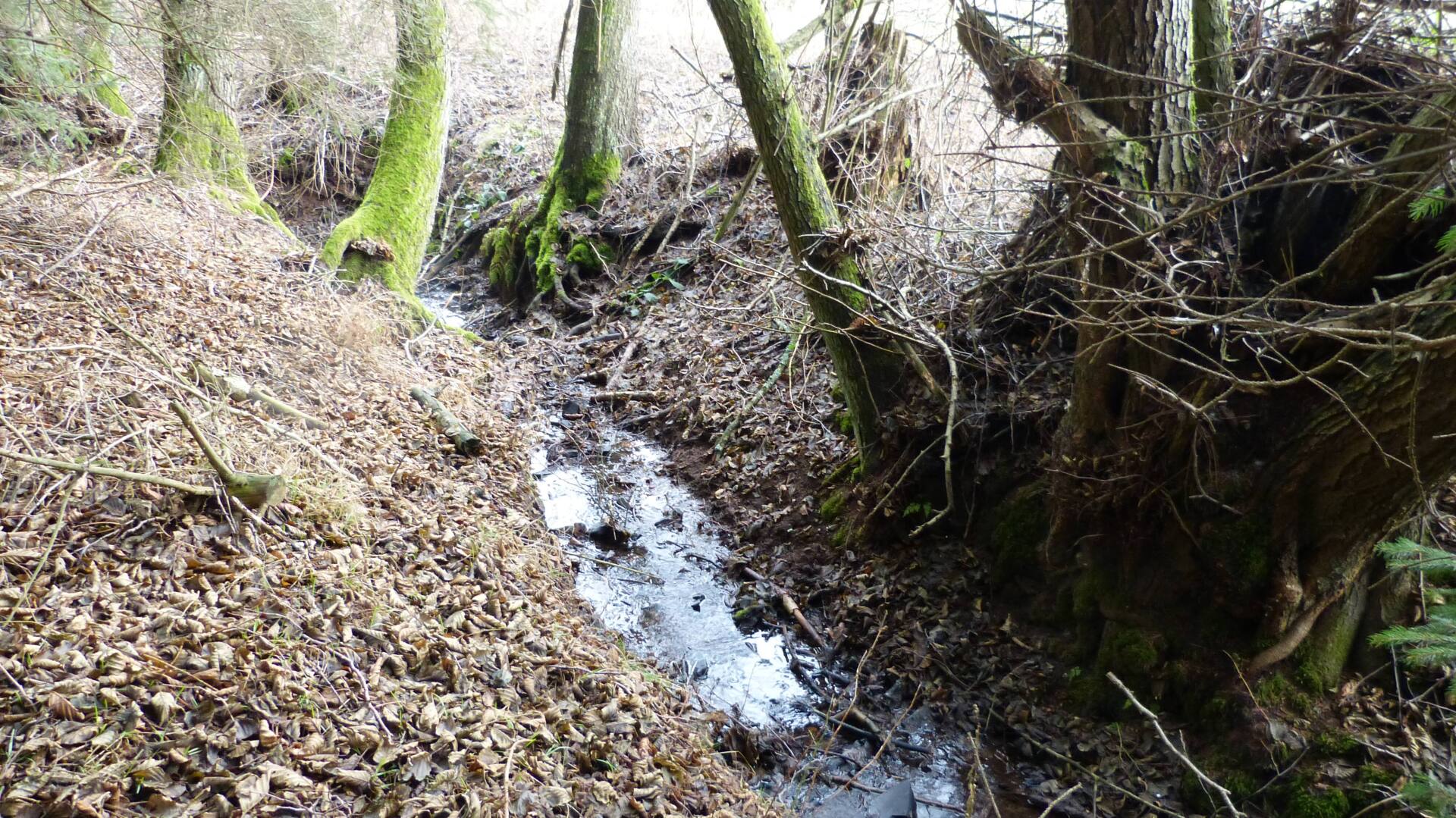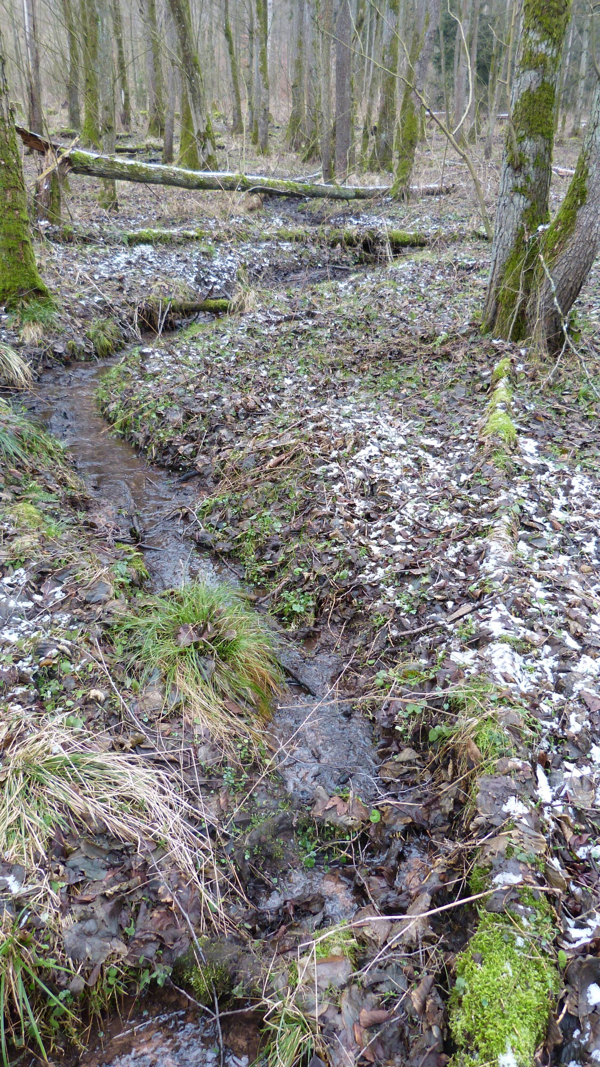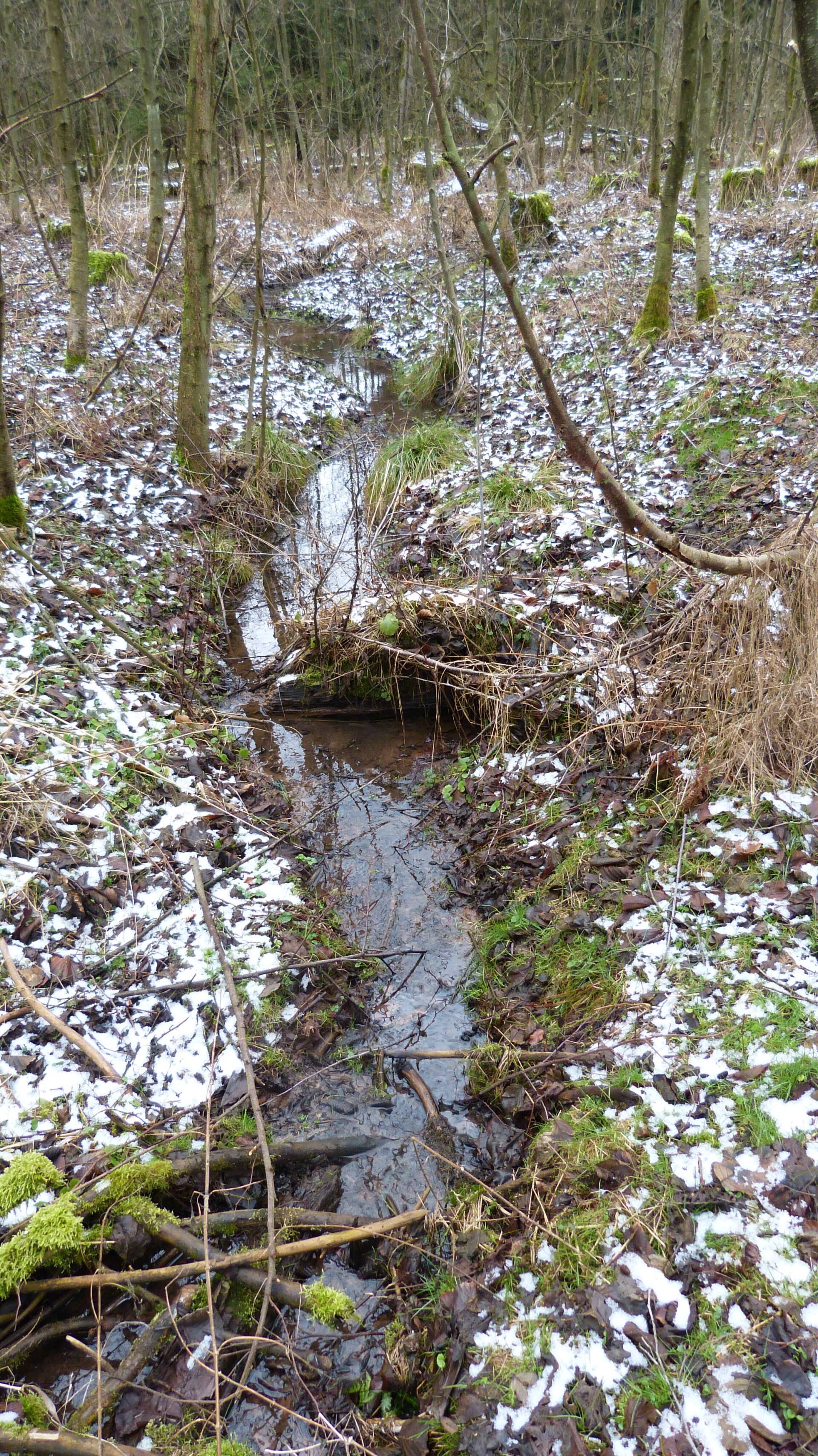 Foto unten NONameBach wiedererscheinen und Fortführung zu einem weiteren Sumpfgebiet in dem auch Feuersalamander wohnen.Der NONameBach führt dann weiter zu den Berghängen wo er die Hänge entwässert