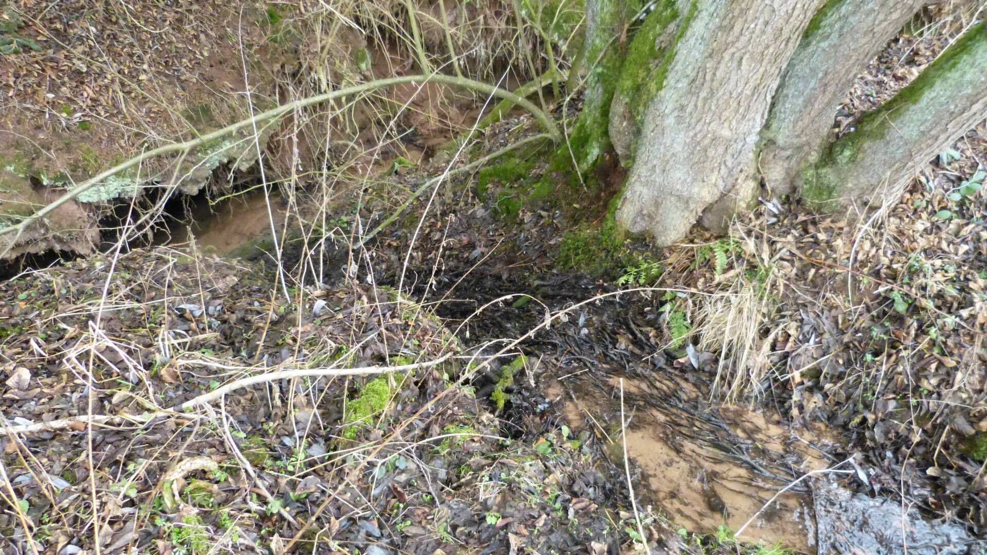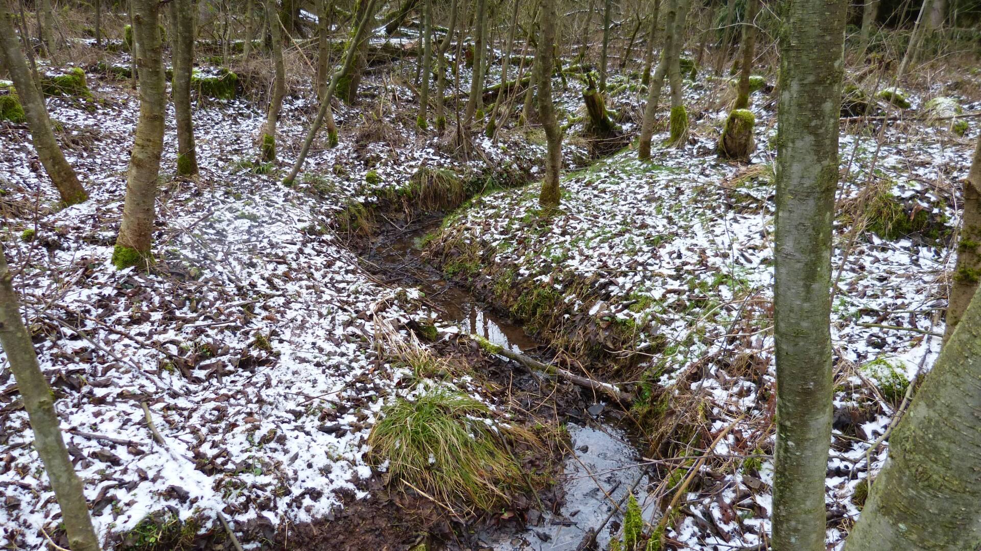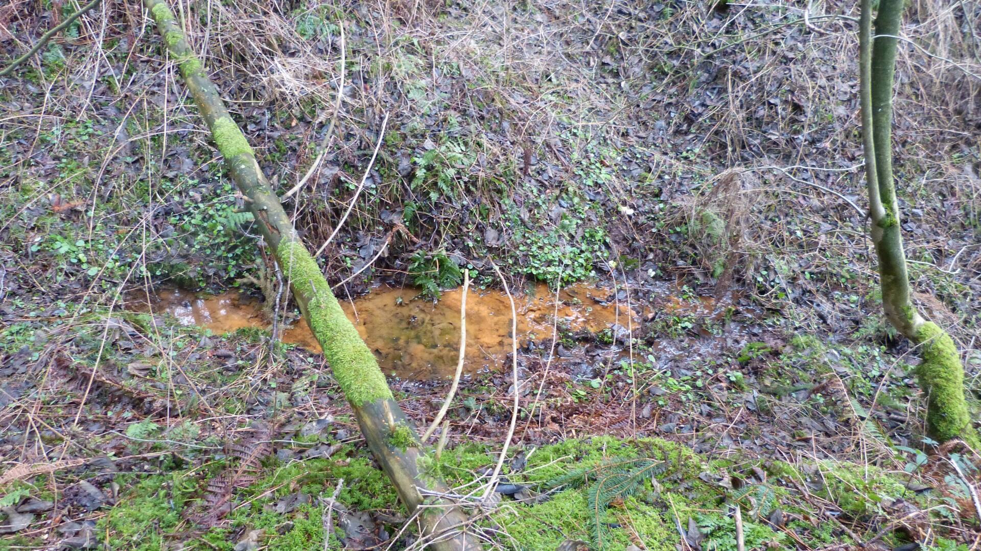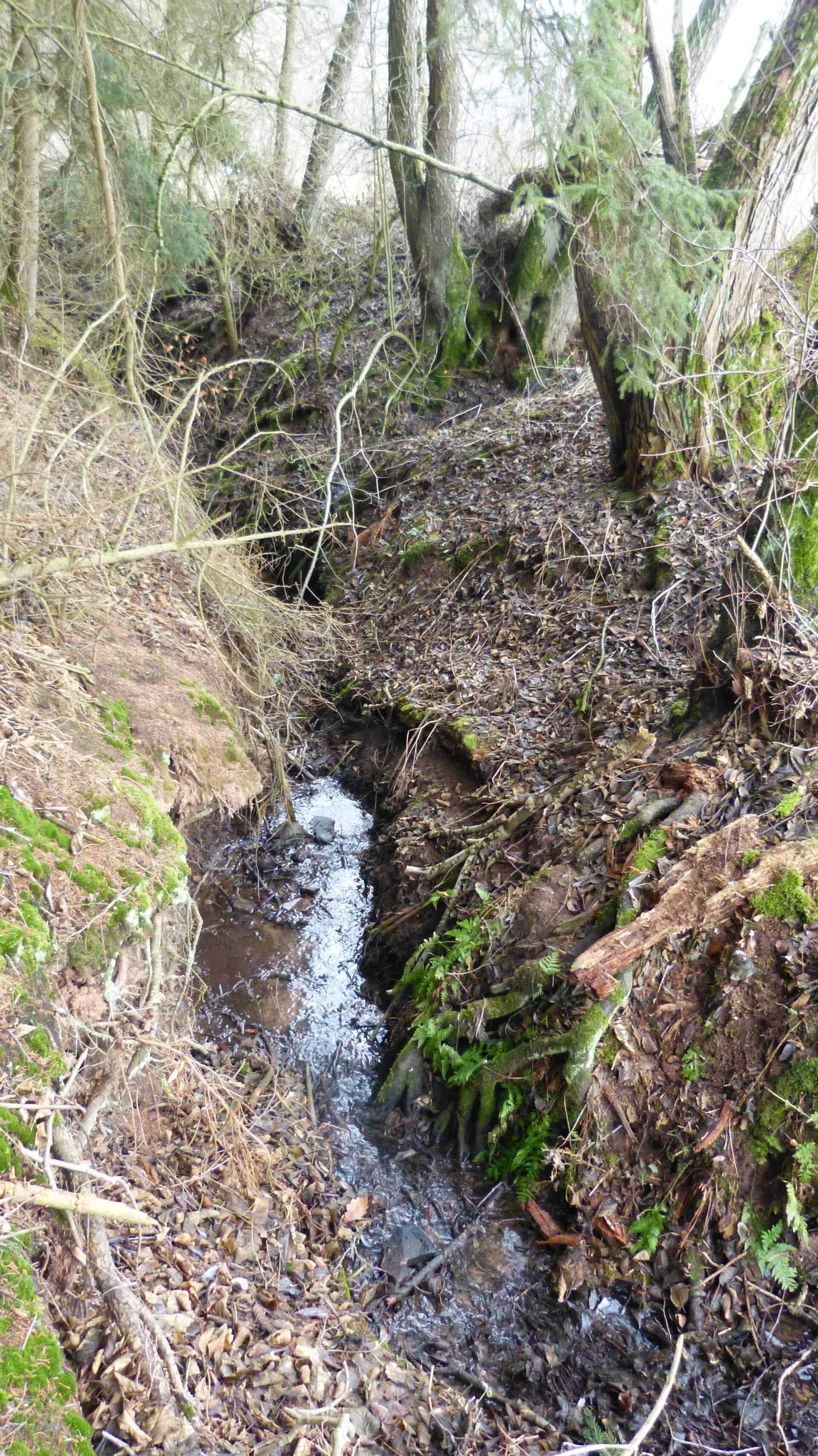 Foto unten NONameBach wiedererscheinen und Fortführung zu einem weiteren Sumpfgebiet in dem auch Feuersalamander wohnen.Der NONameBach führt dann weiter zu den Berghängen wo er die Hänge entwässert