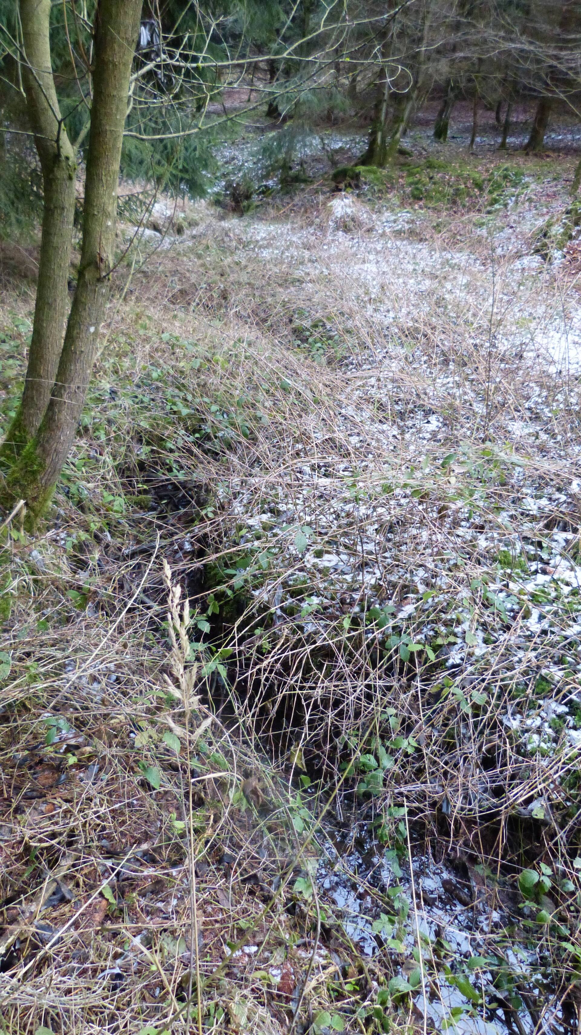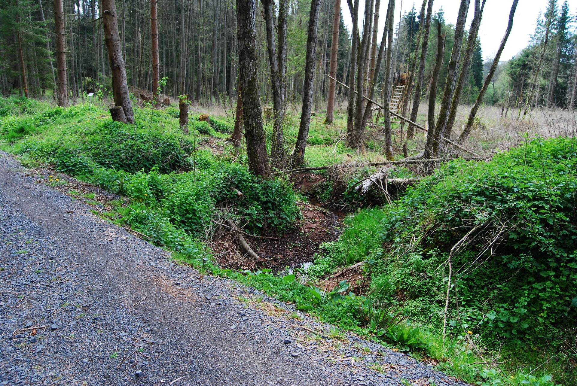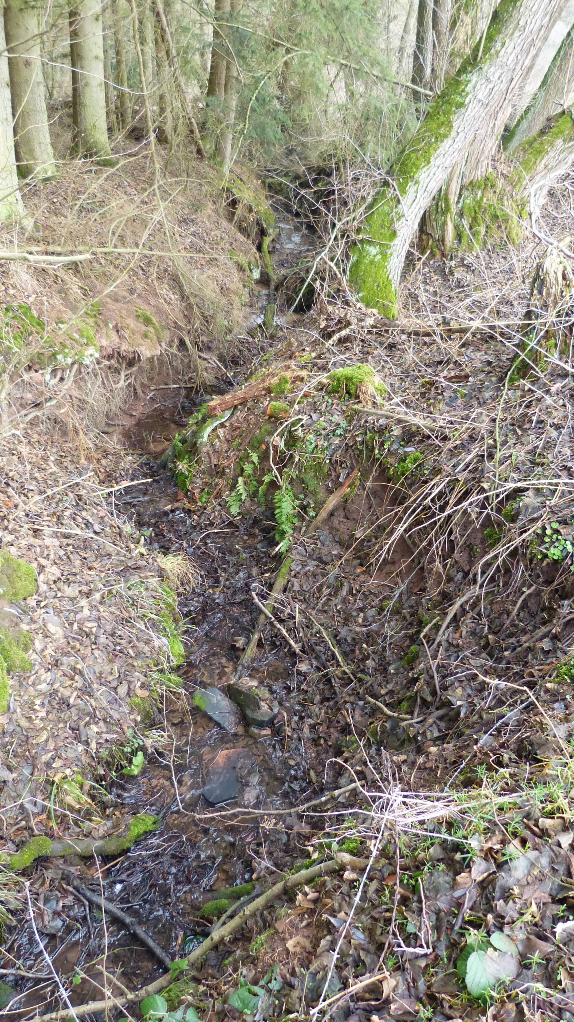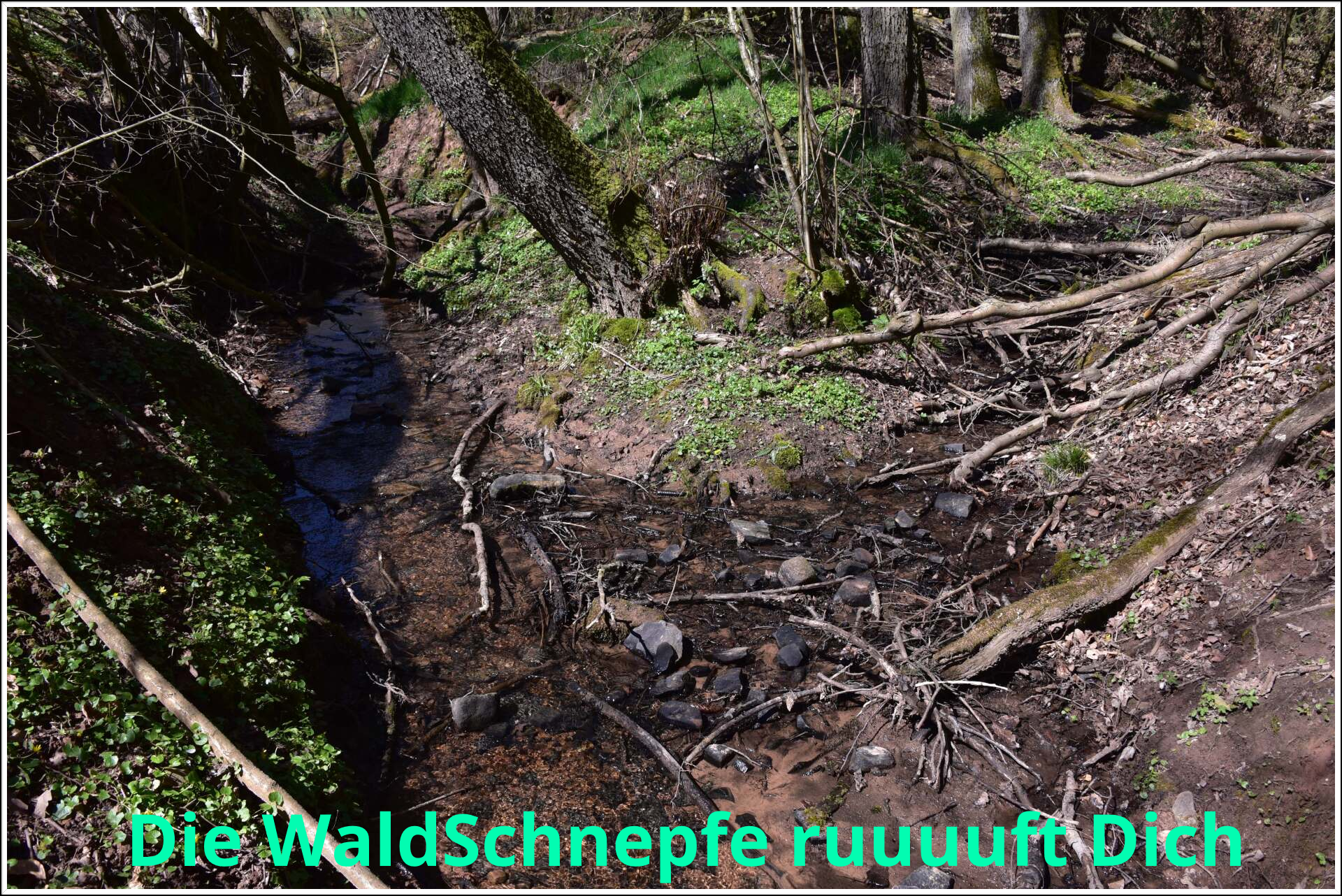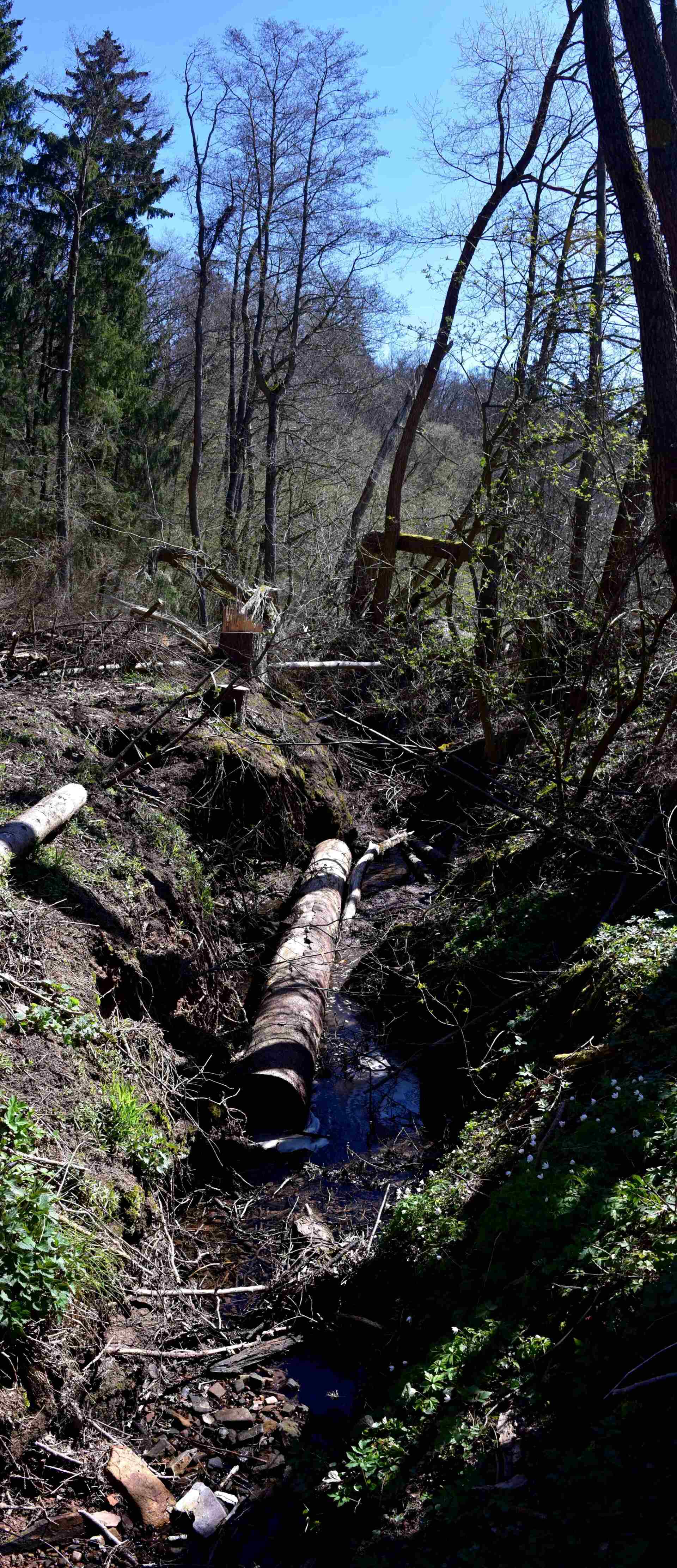 Sooo, hier bin ich im untigen Foto auf dem Waldweg angekommen und blicke Richtung Durchfluss des Tiefenbachs unter dem Waldweg, der von Rechts, momentan ohne Wasser, unter dem Waldweg im Rohr nach links in das Feuchtgebiet der Feuersalamander und Waldschnepfen fließt, wenn Wasser vorhanden ist.