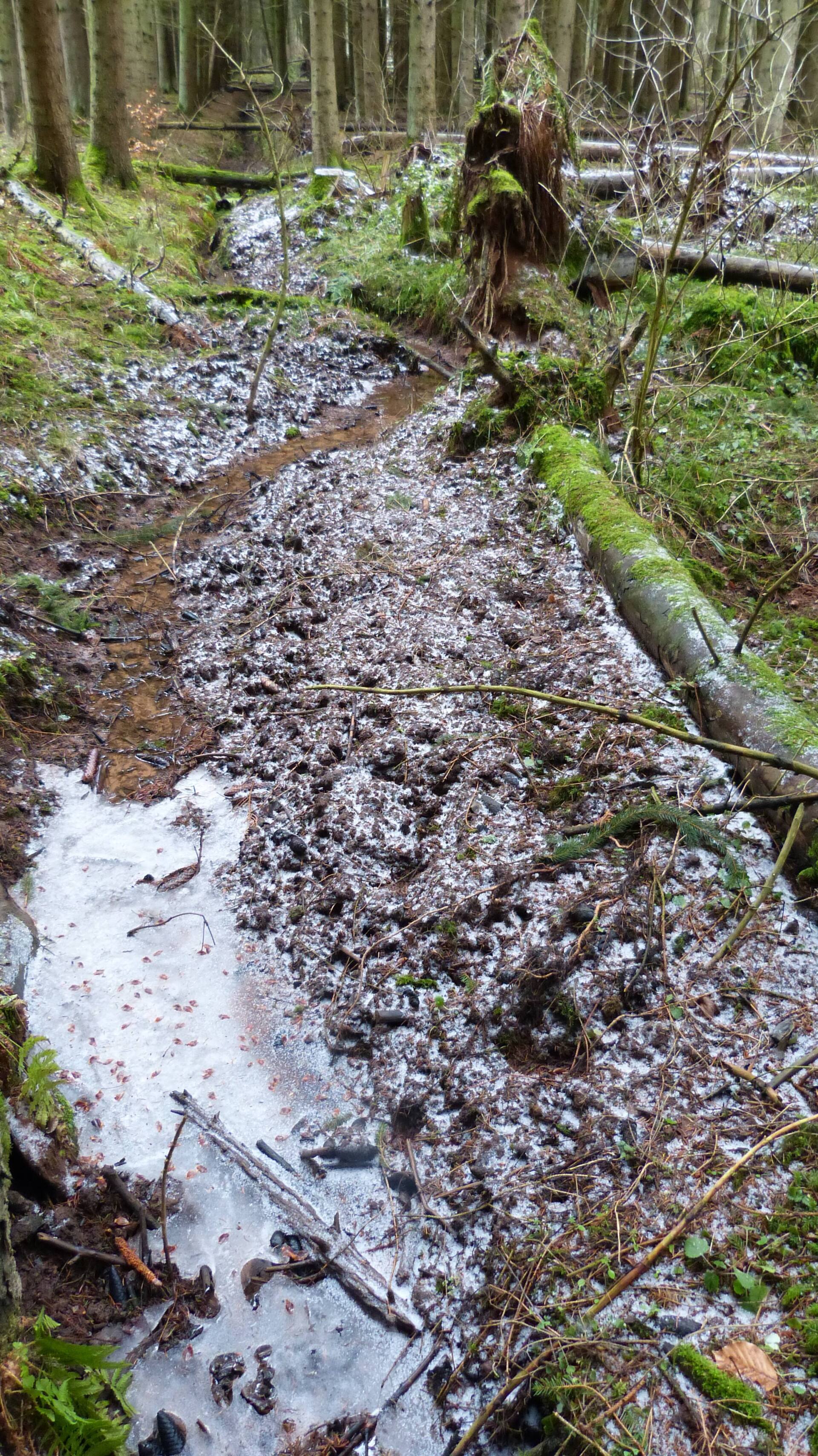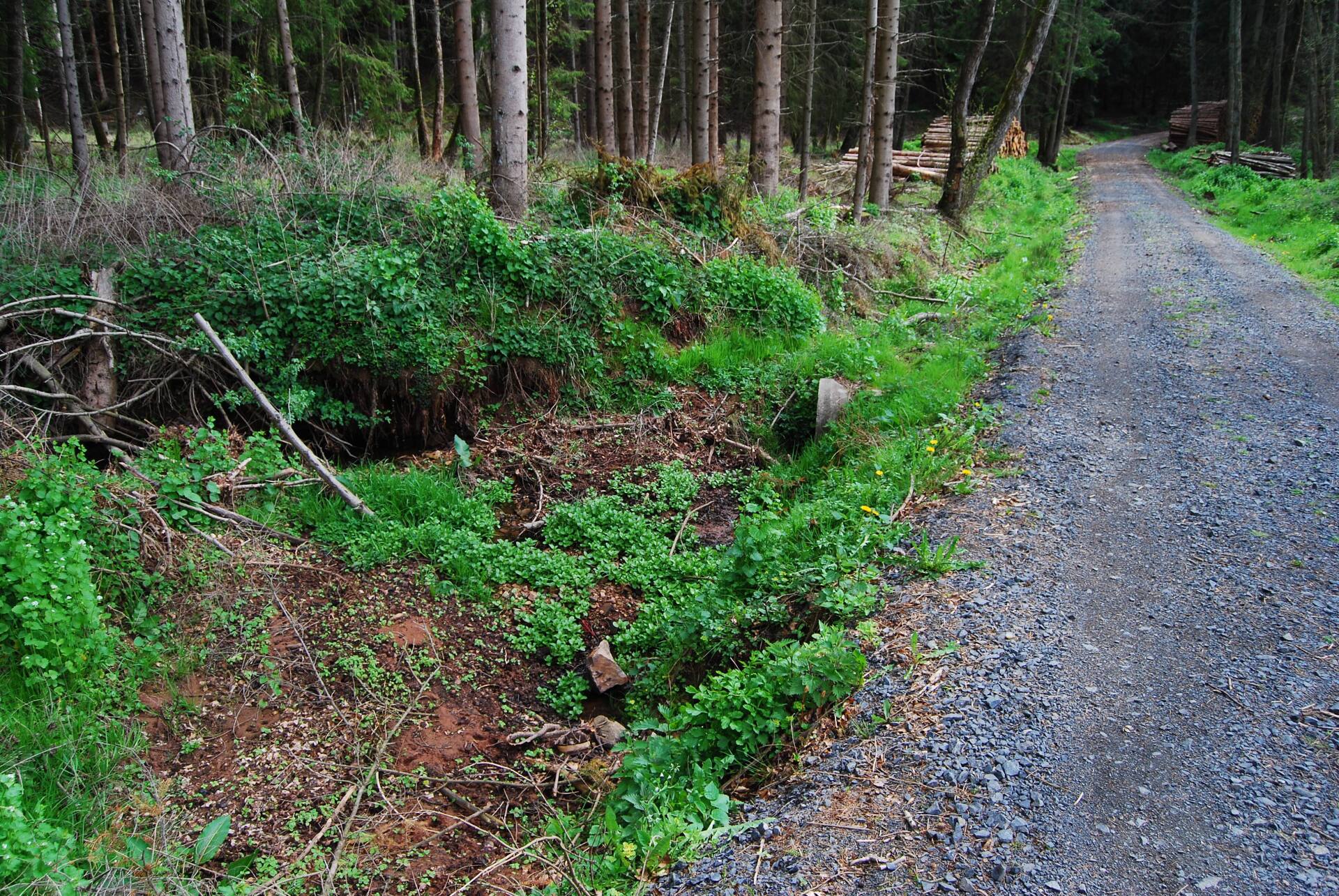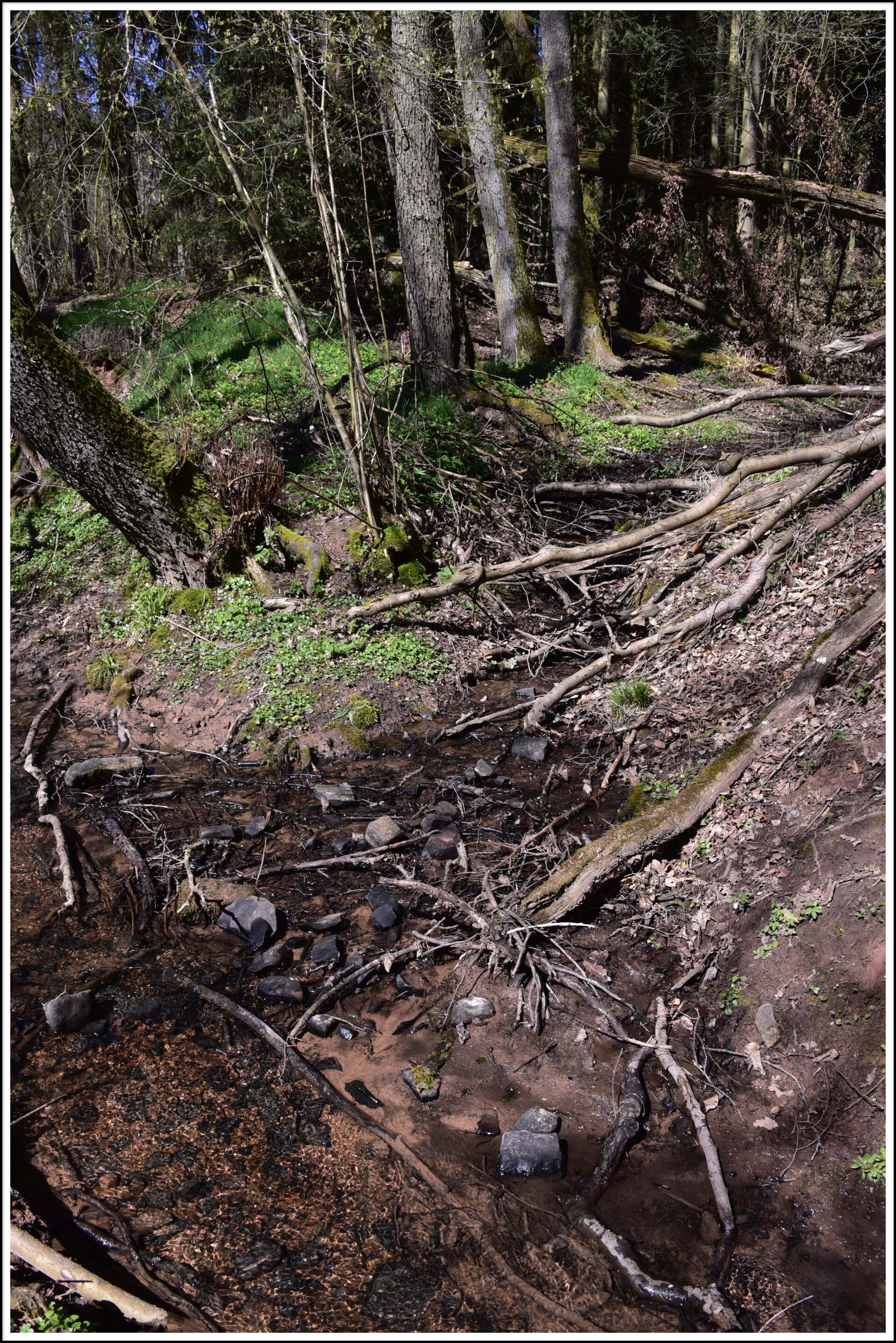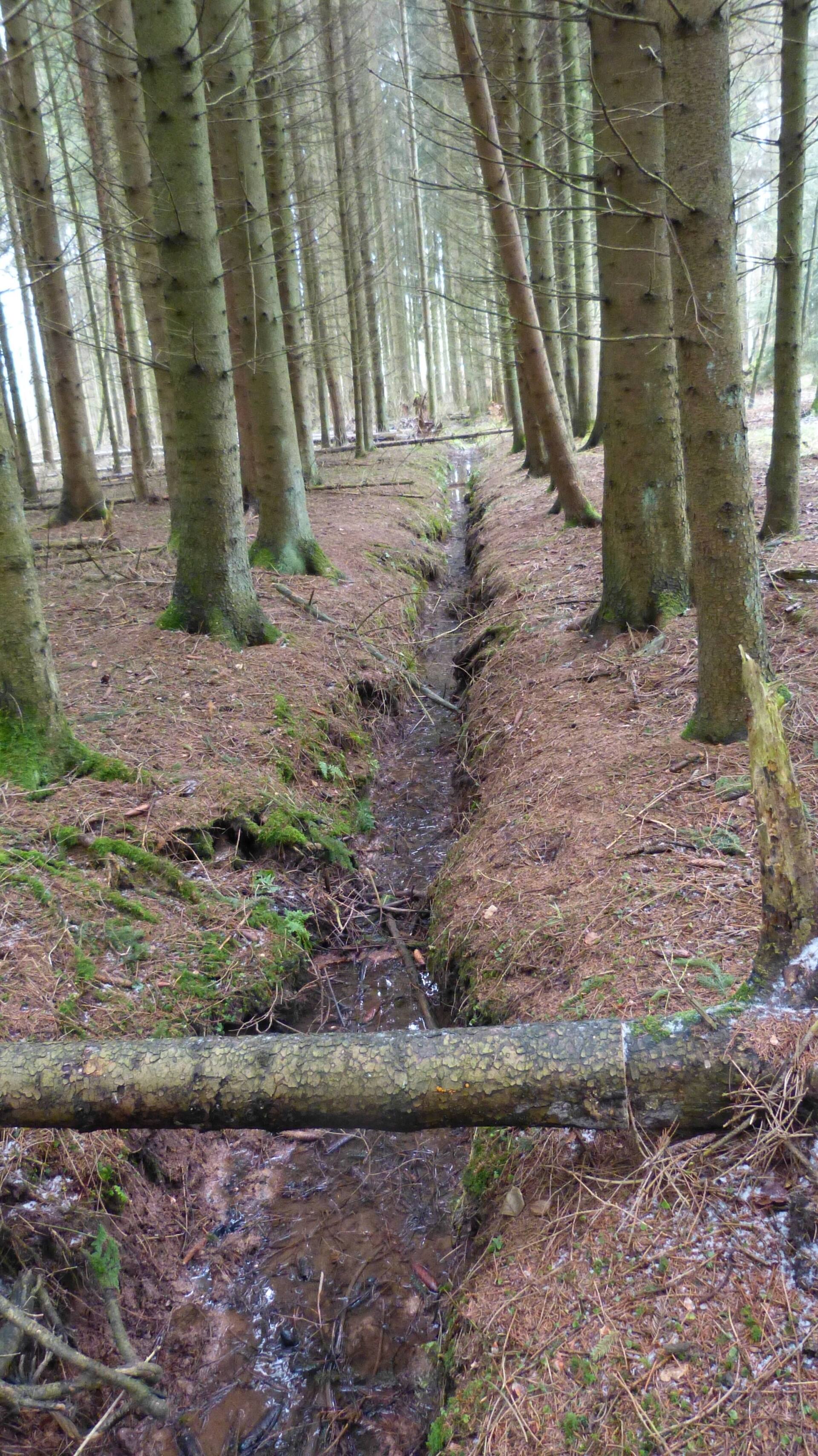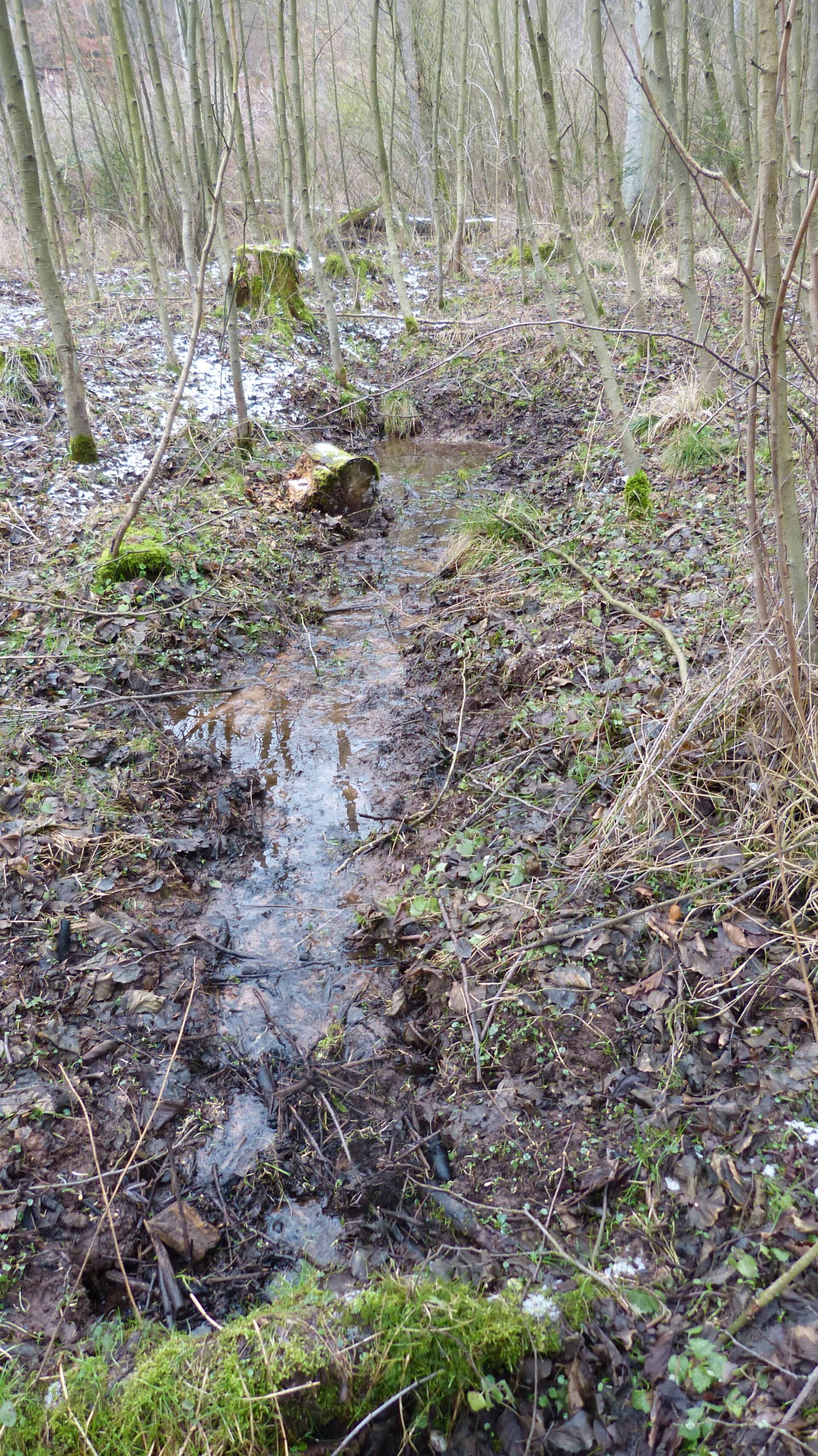 Sooo, hier bin ich im untigen Foto auf dem Waldweg angekommen und blicke Richtung Durchfluss des Tiefenbachs unter dem Waldweg, der von Rechts, momentan ohne Wasser, unter dem Waldweg im Rohr nach links in das Feuchtgebiet der Feuersalamander und Waldschnepfen fließt, wenn Wasser vorhanden ist.