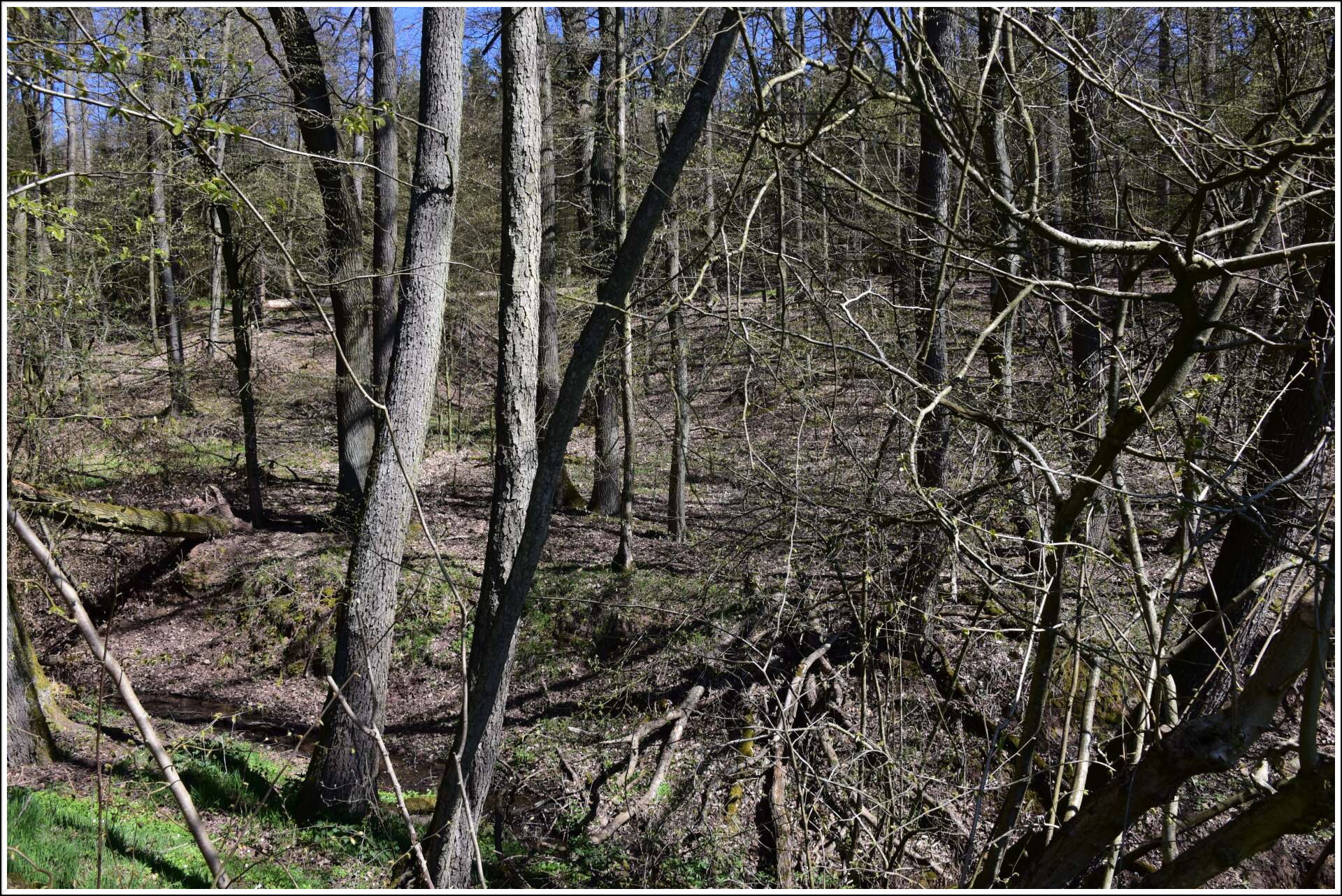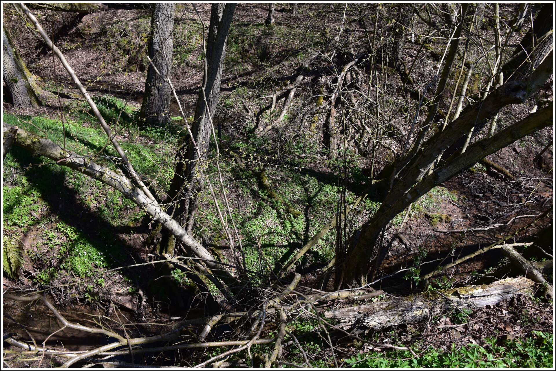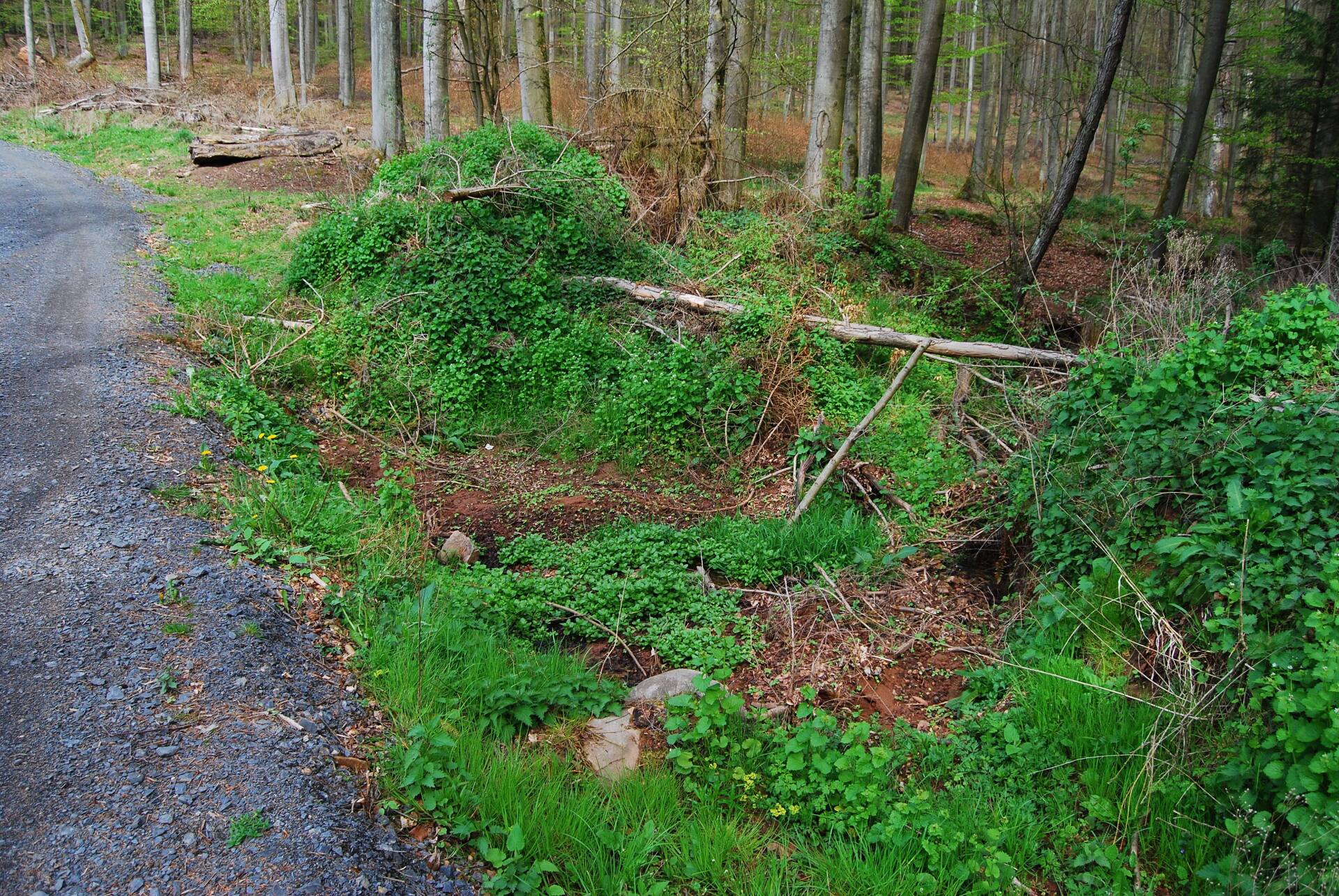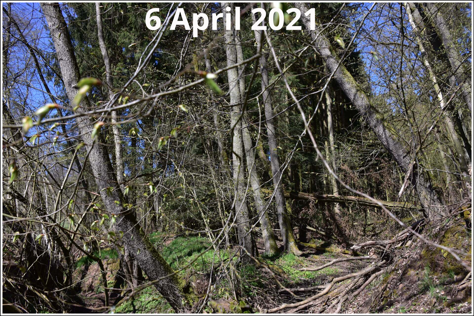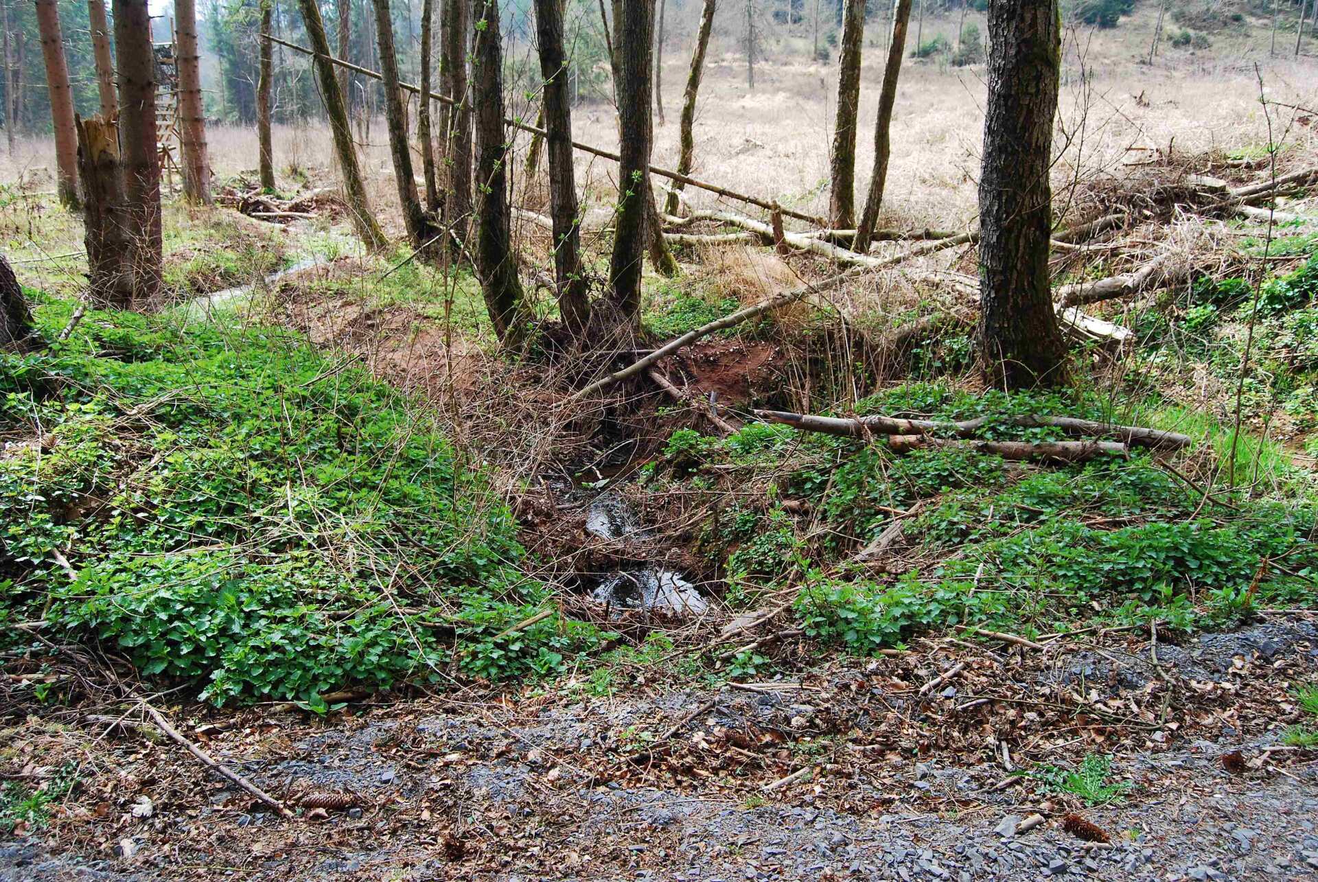 Sooo, hier bin ich im untigen Foto auf dem Waldweg angekommen und blicke Richtung Durchfluss des Tiefenbachs unter dem Waldweg, der von Rechts, momentan ohne Wasser, unter dem Waldweg im Rohr nach links in das Feuchtgebiet der Feuersalamander und Waldschnepfen fließt, wenn Wasser vorhanden ist.