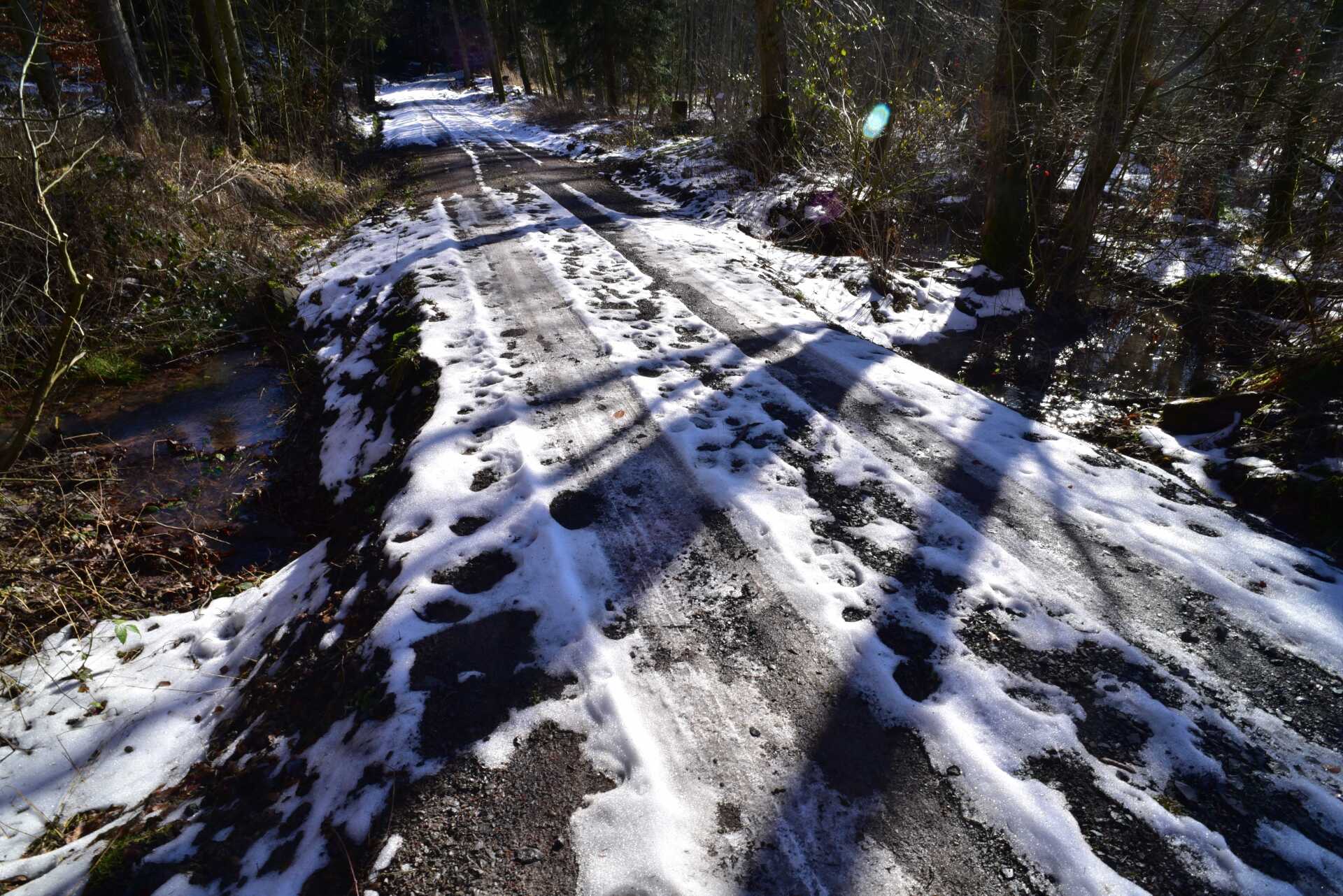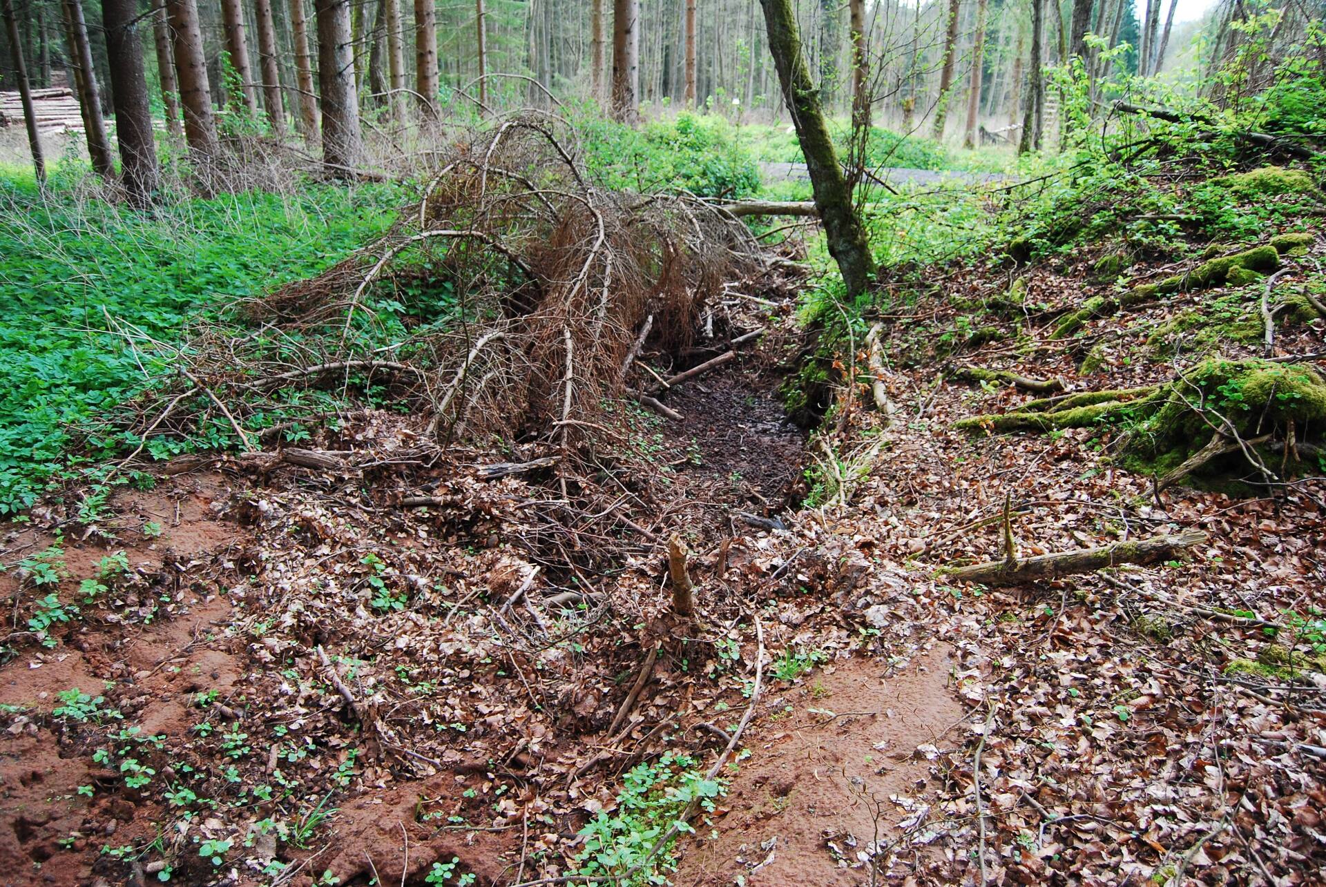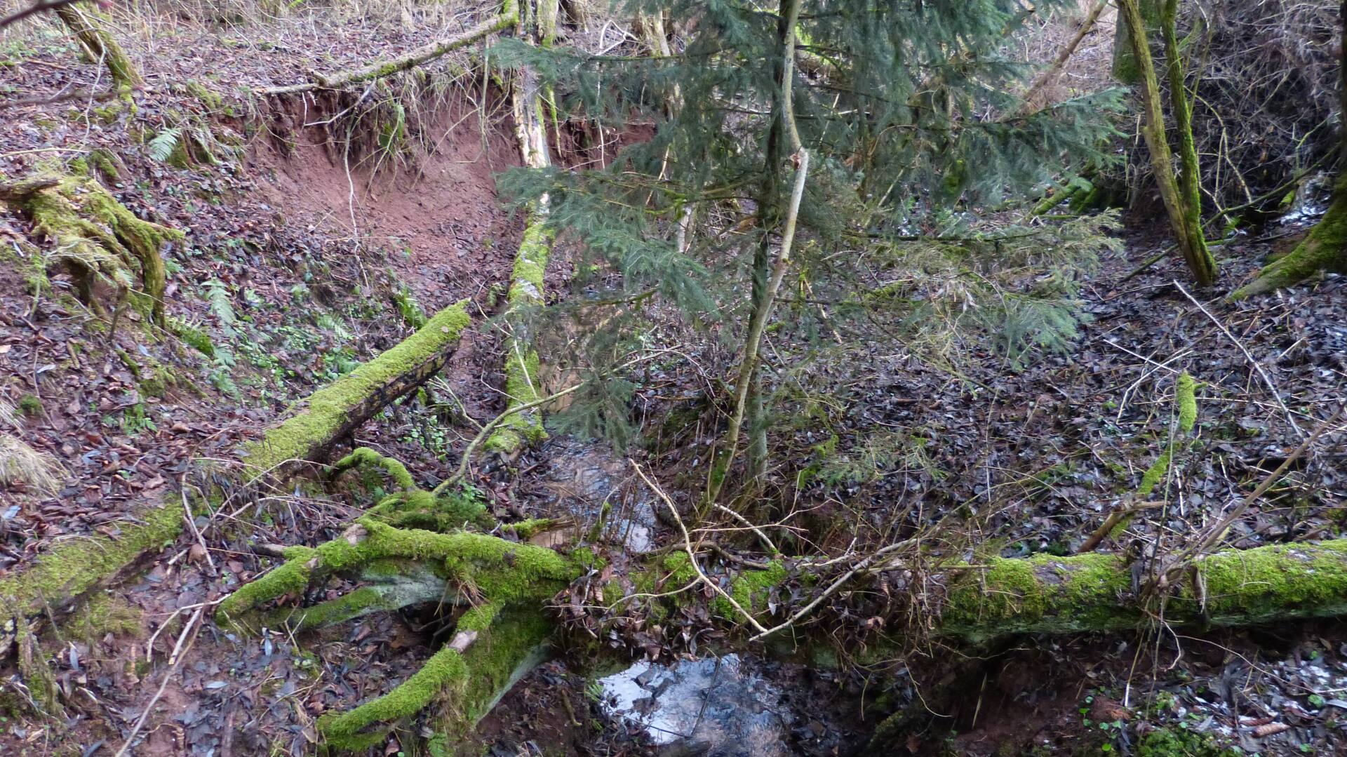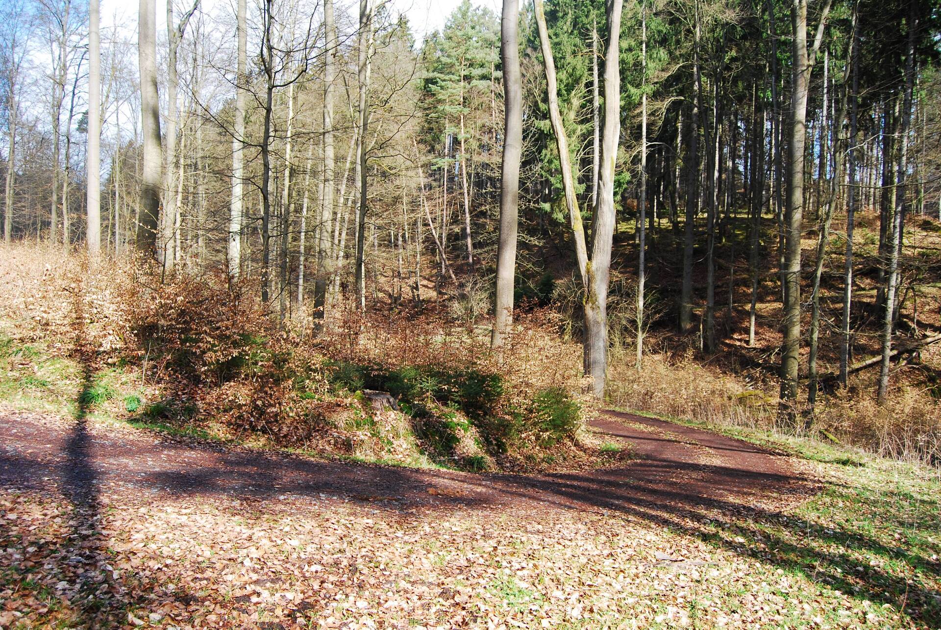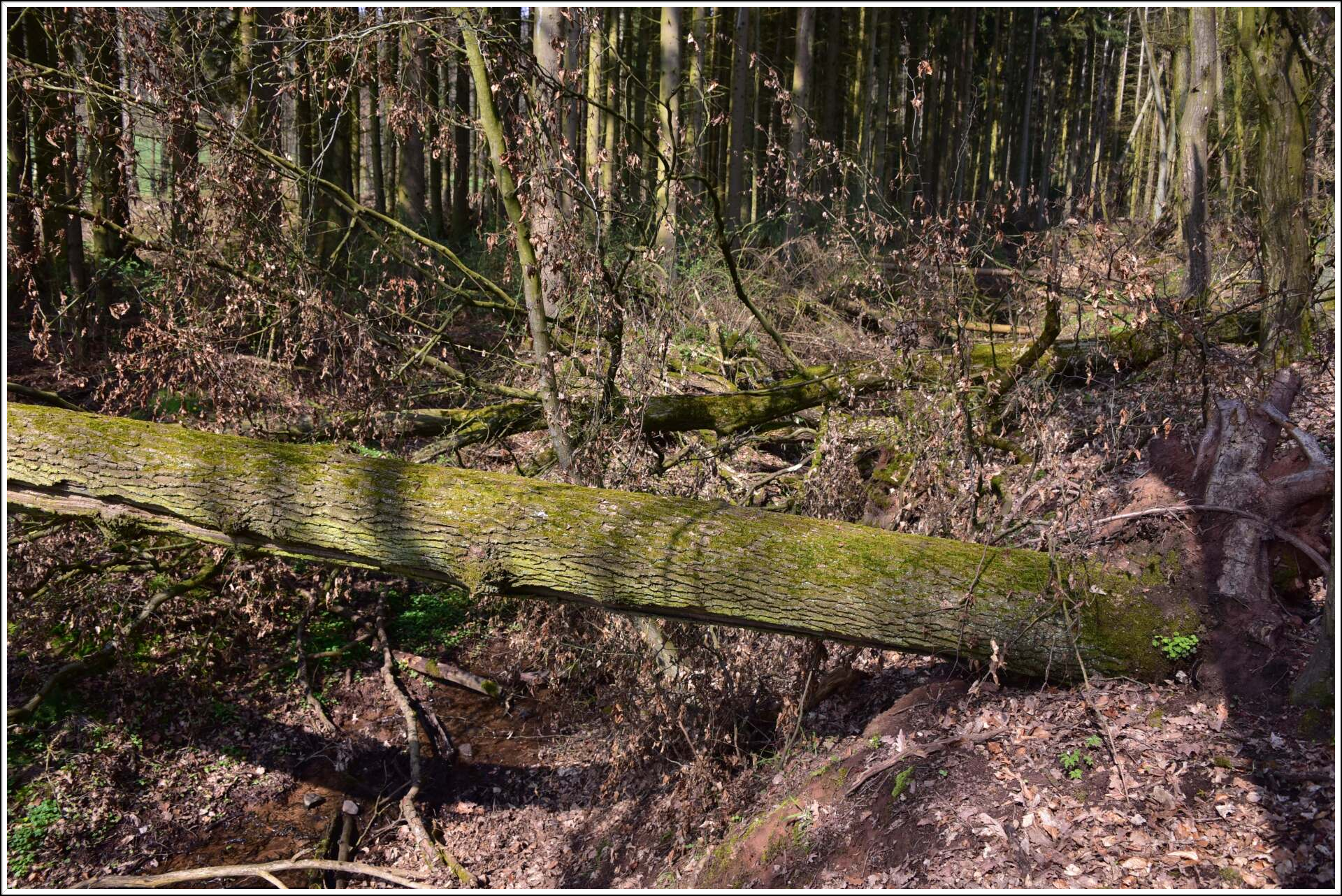Sooo, hier bin ich im untigen Foto auf dem Waldweg angekommen und blicke Richtung Durchfluss des Tiefenbachs unter dem Waldweg, der von Rechts, momentan ohne Wasser, unter dem Waldweg im Rohr nach links in das Feuchtgebiet der Feuersalamander und Waldschnepfen fließt, wenn Wasser vorhanden ist.