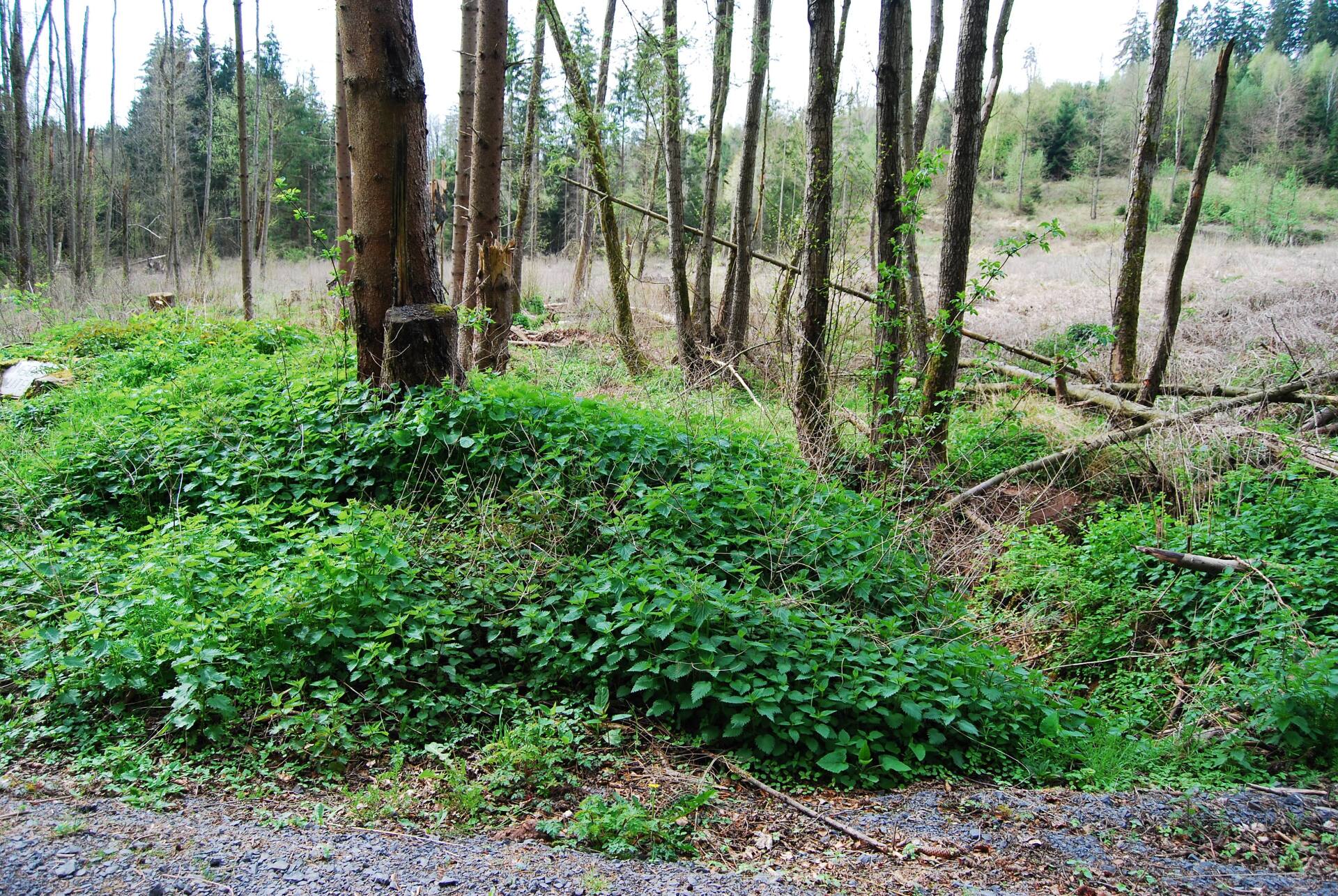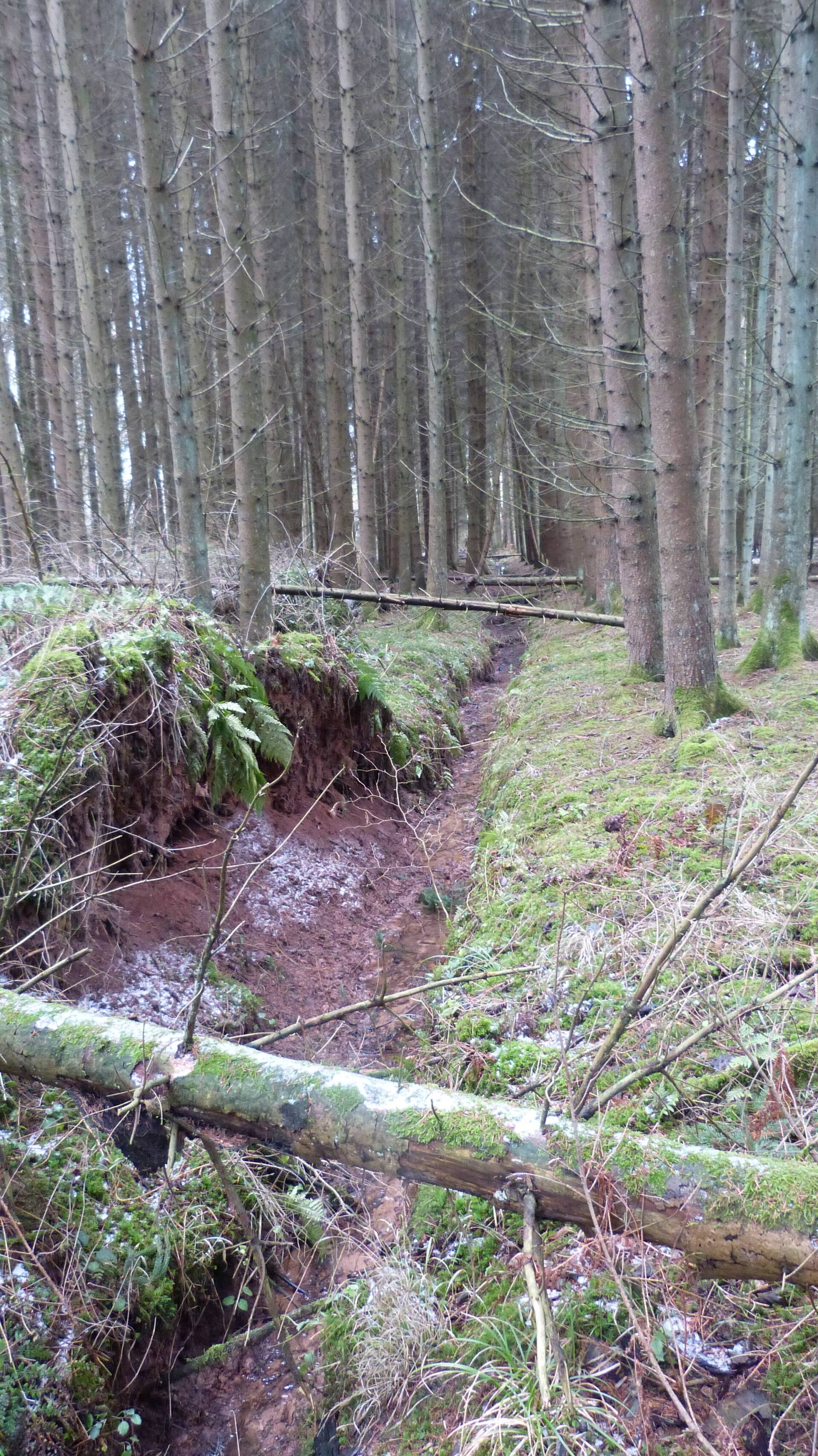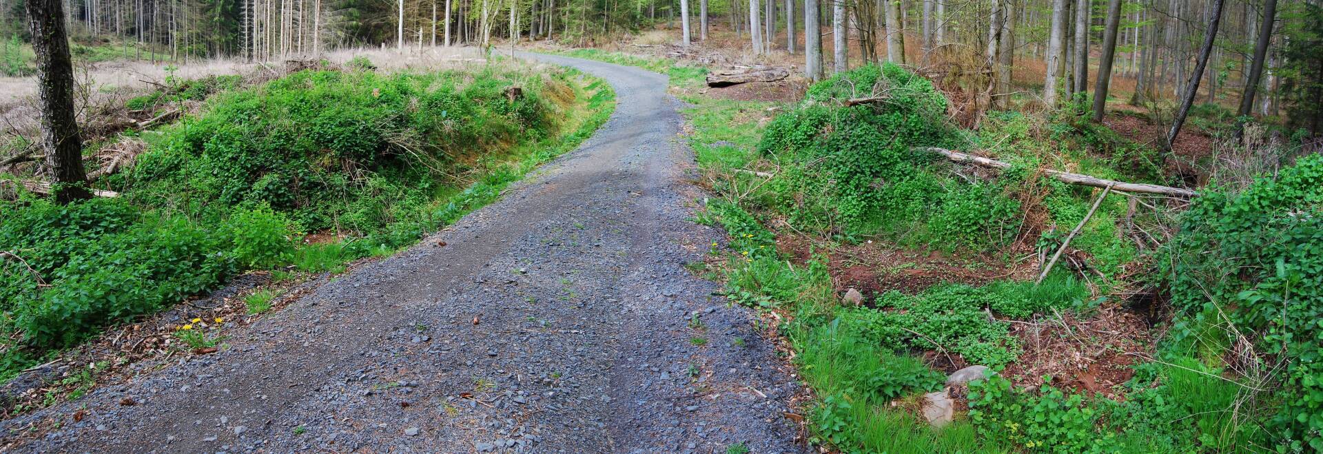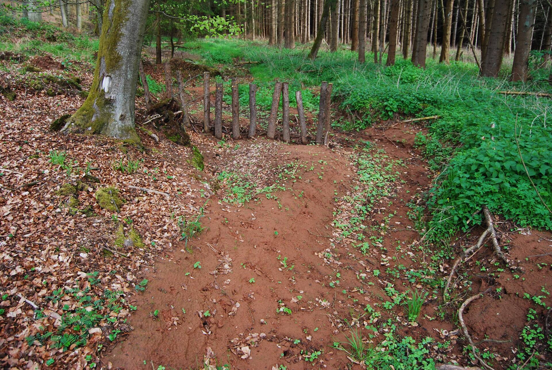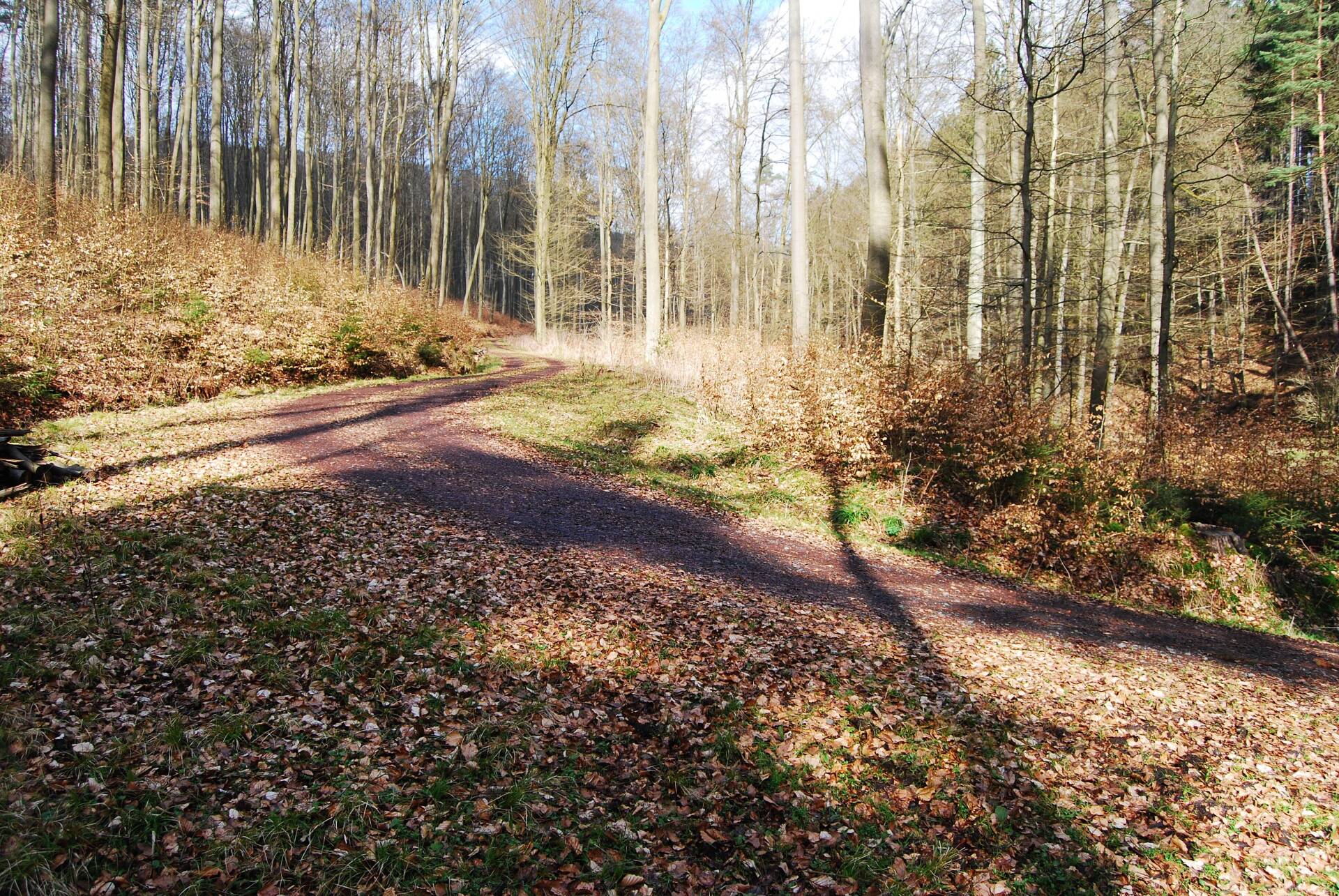 Sooo, hier bin ich im untigen Foto auf dem Waldweg angekommen und blicke Richtung Durchfluss des Tiefenbachs unter dem Waldweg, der von Rechts, momentan ohne Wasser, unter dem Waldweg im Rohr nach links in das Feuchtgebiet der Feuersalamander und Waldschnepfen fließt, wenn Wasser vorhanden ist.