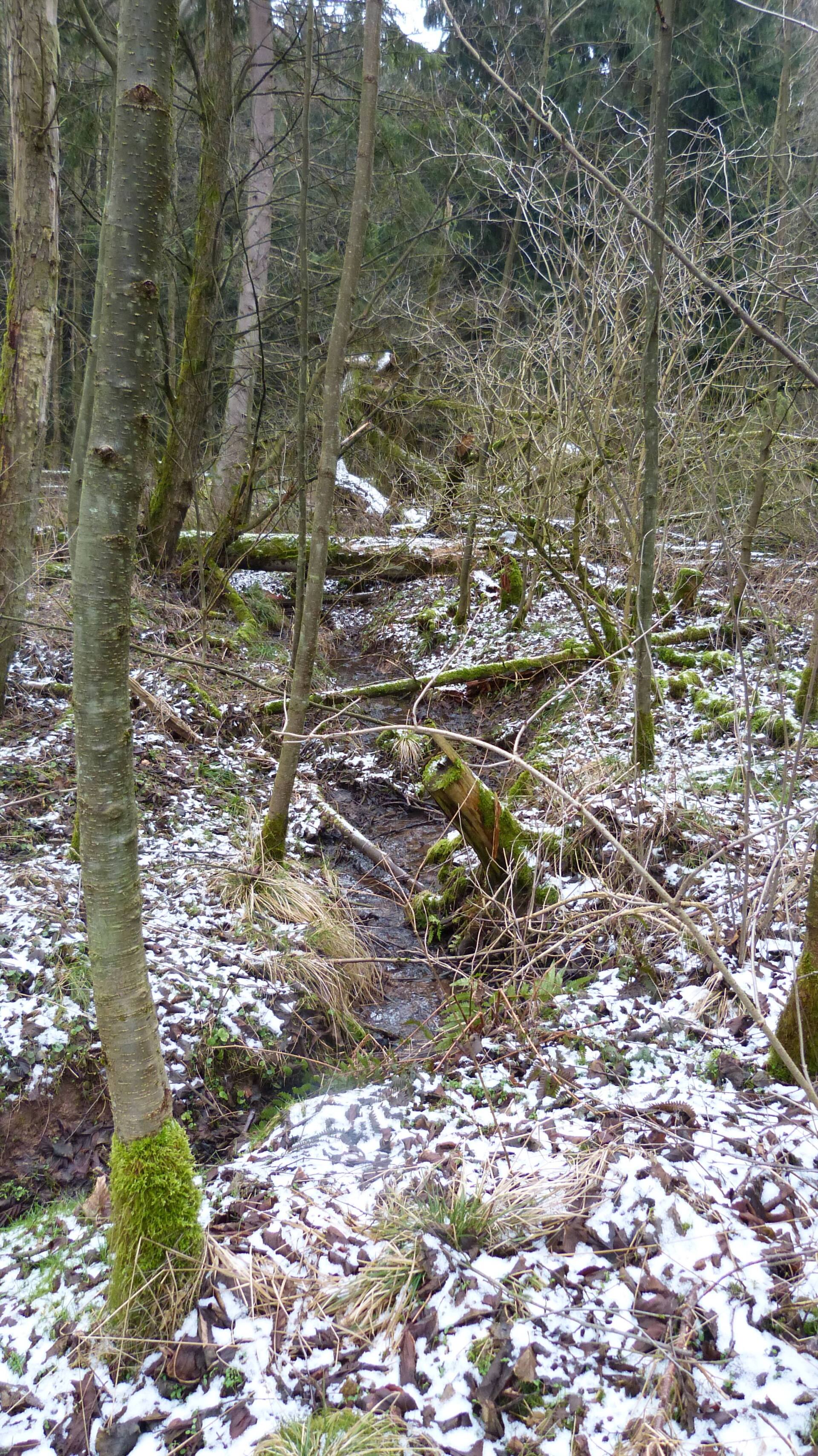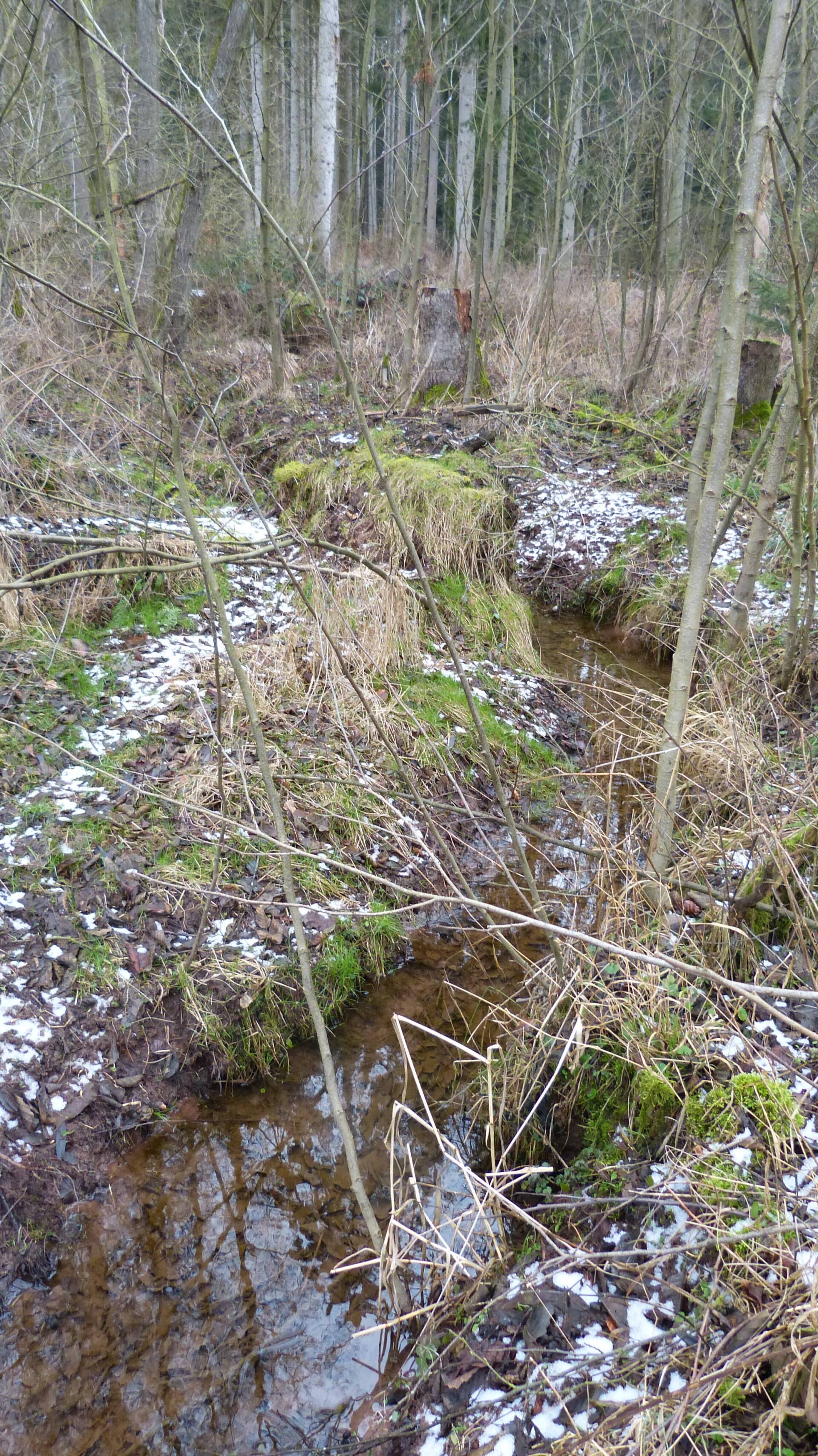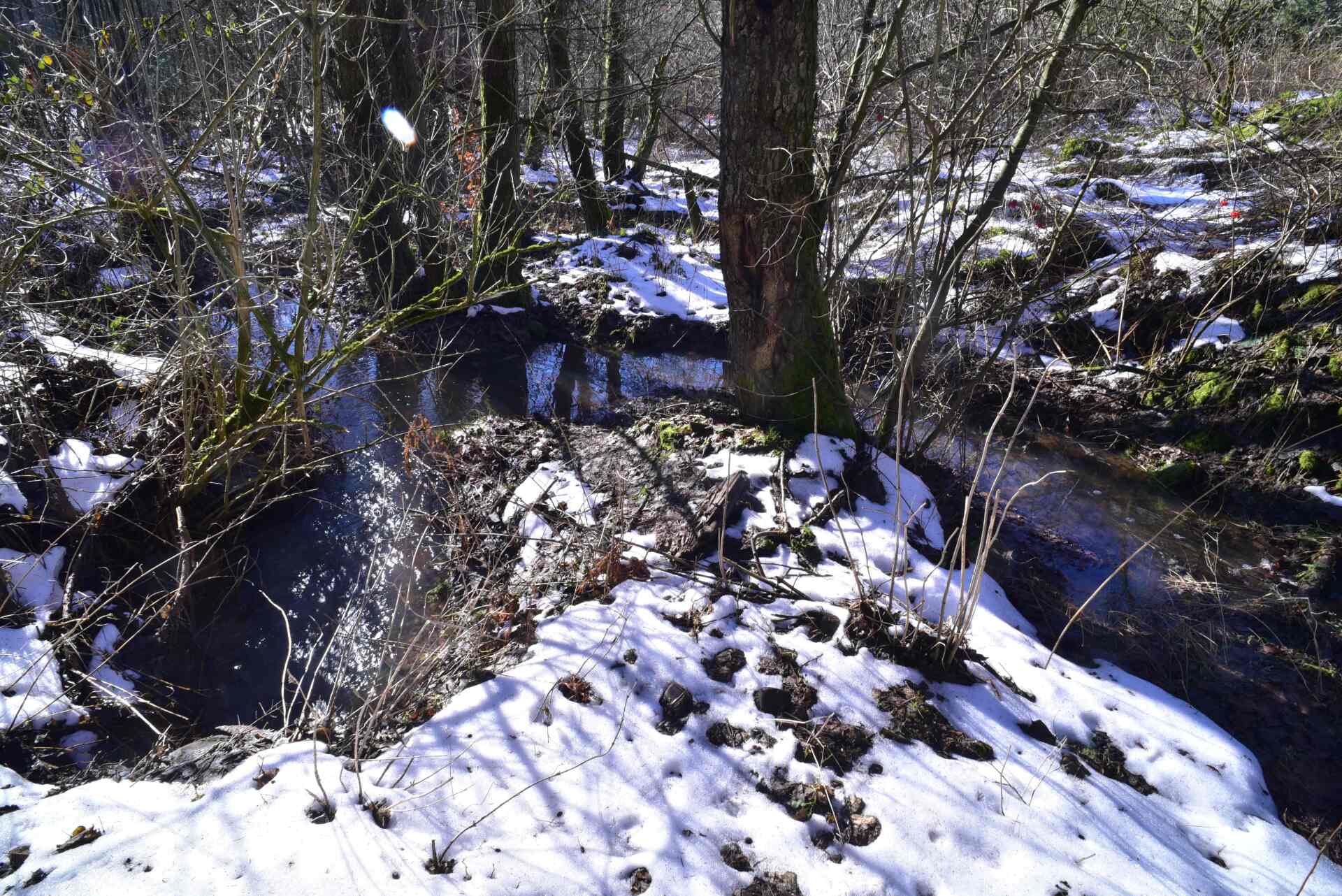 An diese beiden obigen Ausflussstellen des Tiefenbachs hinein in das SchnepfenSumpfBiotop dort laichte jedes Jahr der Feuersalamander und ich konnte in den beiden ausgewaschenen Tiefenbachvertiefungen die Larvenentwicklung beobachten
